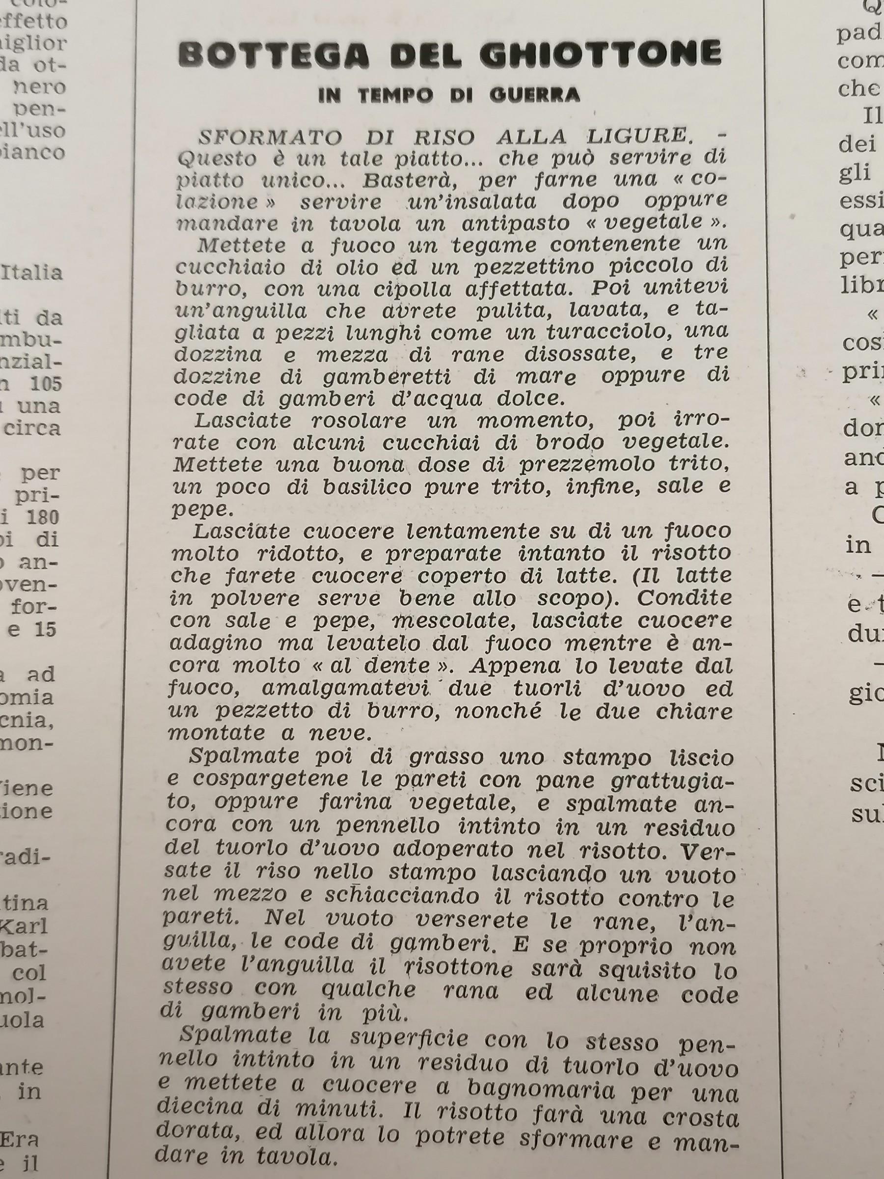 La ricetta dello Sformato di riso alla ligure per la rubrica "Bottega del ghiottone in tempo di guerra", 27 settembre 1942
