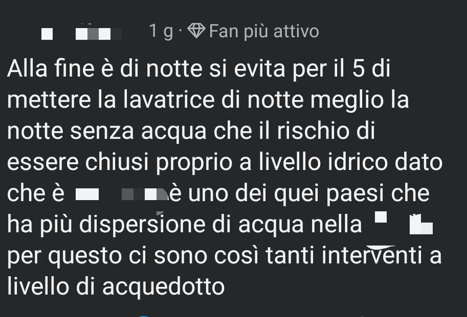 Alla fine è di notte si evita per il 5 di mettere la lavatrice di notte meglio la notte senza acqua che il rischio di essere chiusi proprio a livello idrico dato che è ... è uno di quei paesi che ha più dispersione di acqua nella ... per questo ci sono così tanti interventi a livello di acquedotto