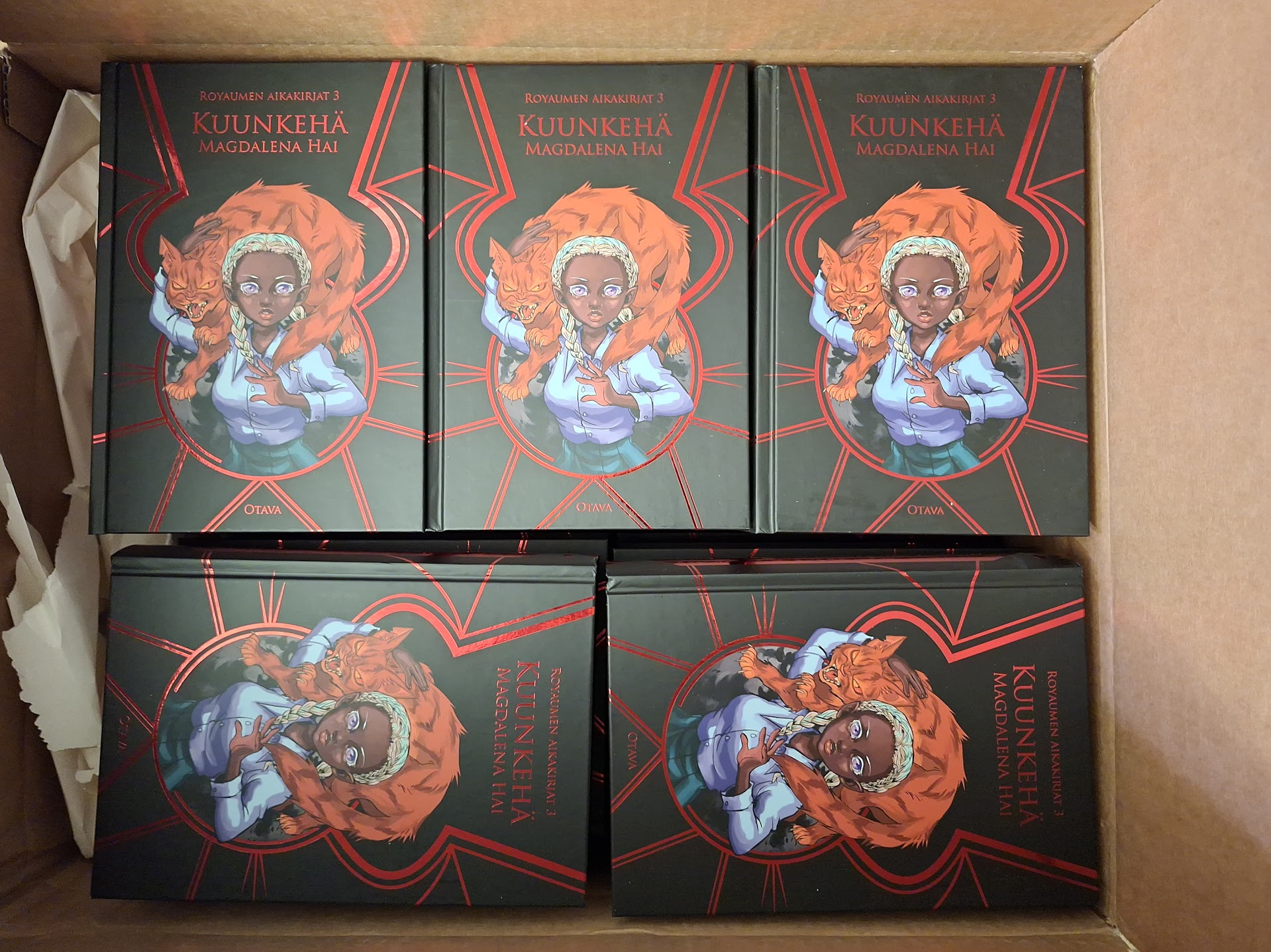 Näkymä isompaan laatikoista: viisi kirjaa, joiden kansi on musta punaisin, metallisin aksentein ja jonka keskiössä on tummaihoinen, valkotukkainen tyttö vihaisen näköinen punainen kissa harteillaan.