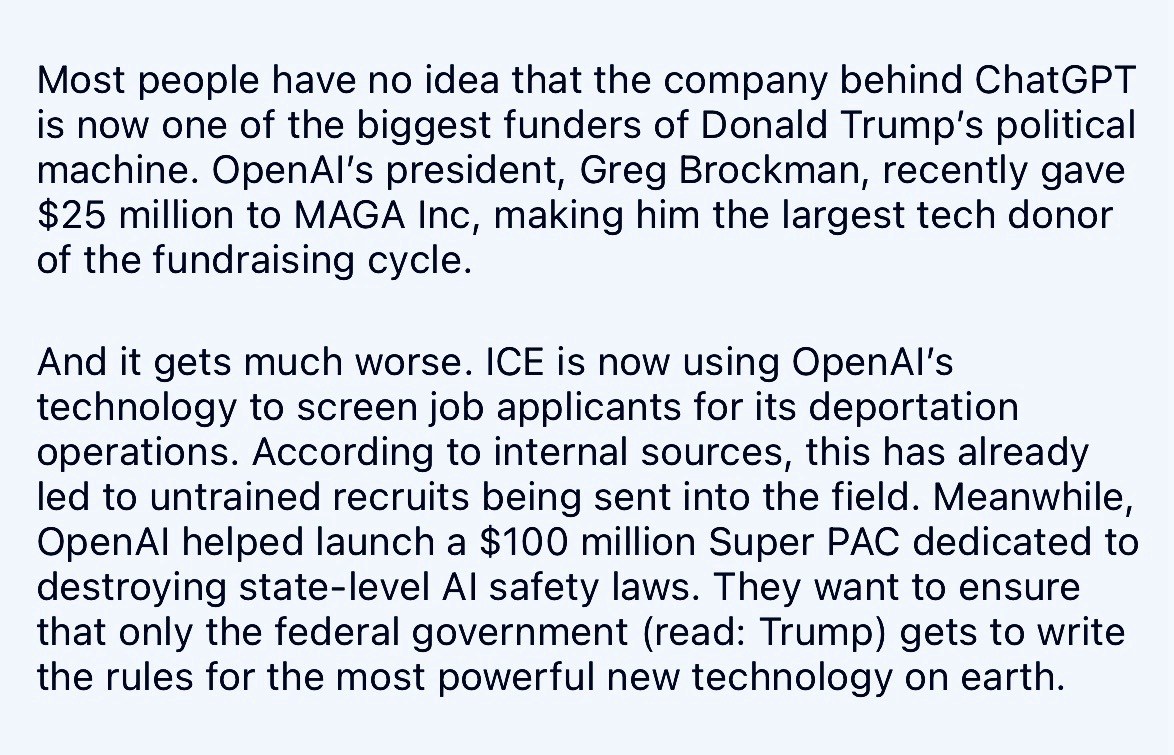 And it gets much worse. ICE is now using OpenAl's technology to screen job applicants for its deportation operations. According to internal sources, this has already led to untrained recruits being sent into the field. Meanwhile, OpenAl helped launch a $100 million Super PAC dedicated to destroying state-level Al safety laws. They want to ensure that only the federal government (read: Trump) gets to write the rules for the most powerful new technology on earth.