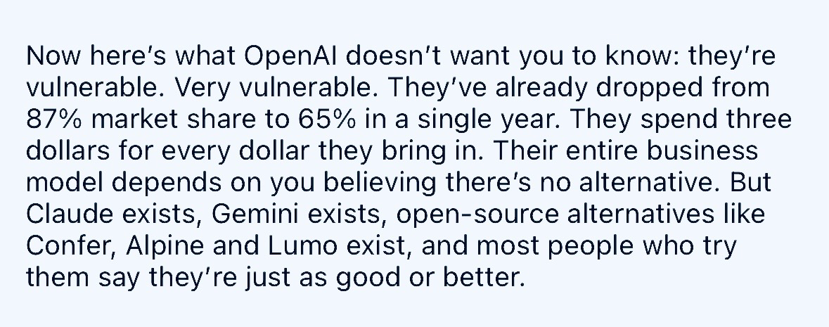 Now here's what OpenAl doesn't want you to know: they're vulnerable. Very vulnerable. They've already dropped from 87% market share to 65% in a single year. They spend three dollars for every dollar they bring in. Their entire business model depends on you believing there's no alternative. But Claude exists, Gemini exists, open-source alternatives like Confer, Alpine and Lumo exist, and most people who try them say they're just as good or better.