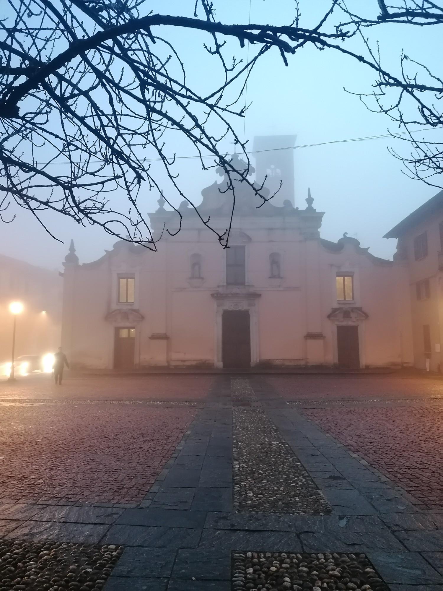 La chiesa di San Francesco, poco distante dalla stazione ferroviaria, emerge dalla nebbiolina del mattino