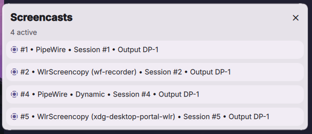Popup showing four screencasts along with their kind (PipeWire or WlrScreencopy), binary name for WlrScreencopy, and cast target at the end.