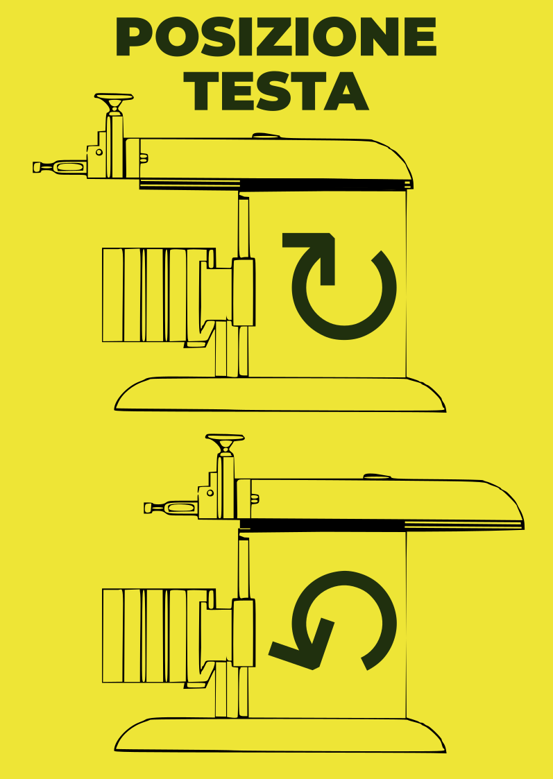 Schema per la posizione della testa della limatrice, con frecce che indicano in che verso girare una manovella per muovere la testa relativamente al corpo della macchina.