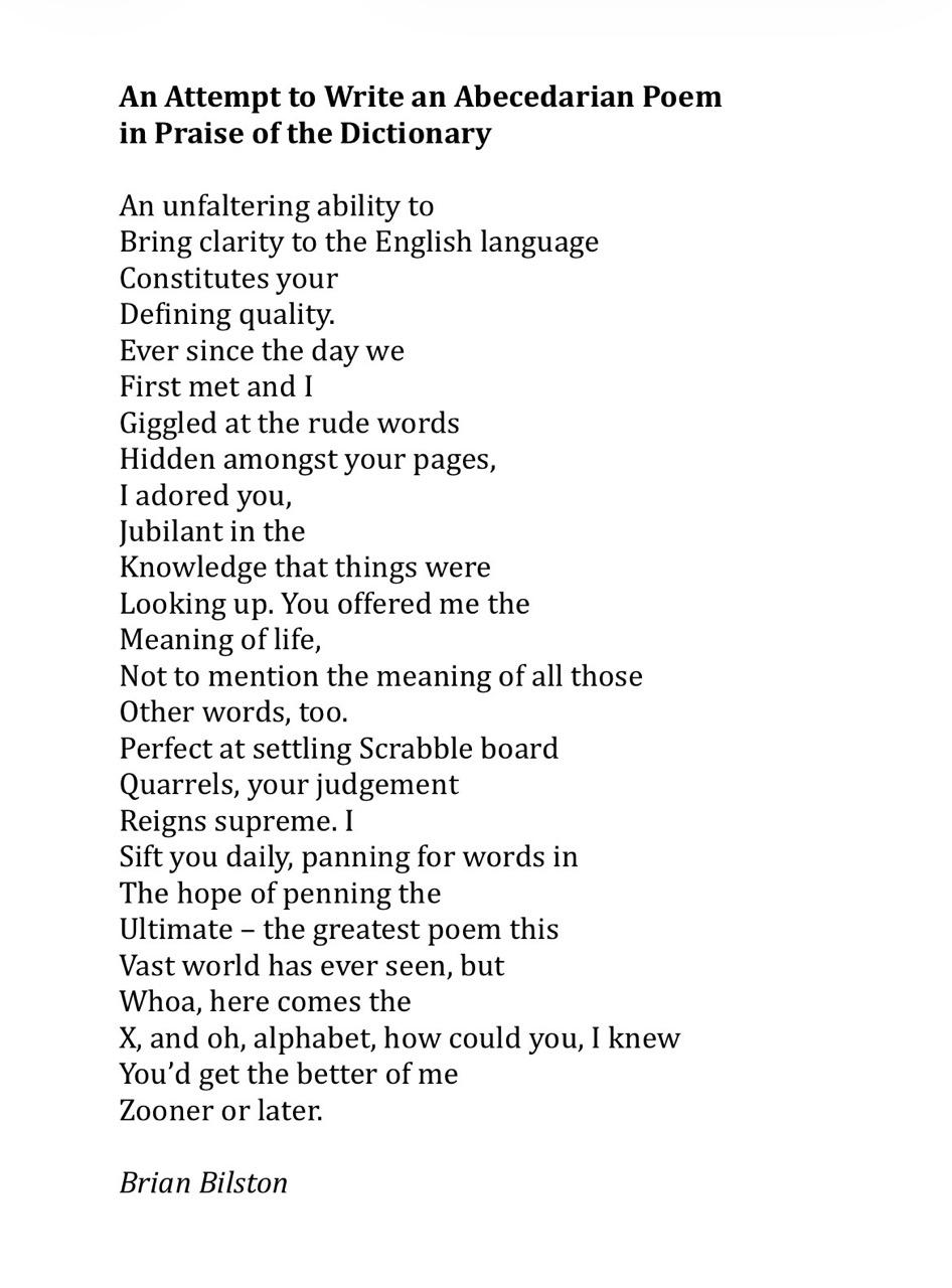 An Attempt to Write an Abecedarian Poem in Praise of the Dictionary An unfaltering ability to Bring clarity to the English language Constitutes your Defining quality. Ever since the day we First met and I Giggled at the rude words Hidden amongst your pages, I adored you, Jubilant in the Knowledge that things were Looking up. You offered me the Meaning of life, Not to mention the meaning of all those Other words, too. Perfect at settling Scrabble board Quarrels, your judgement Reigns supreme. I Sift you daily, panning for words in The hope of penning the Ultimate – the greatest poem this Vast world has ever seen, but Whoa, here comes the X, and oh, alphabet, how could you, I knew You’d get the better of me Zooner or later. Brian Bilston
