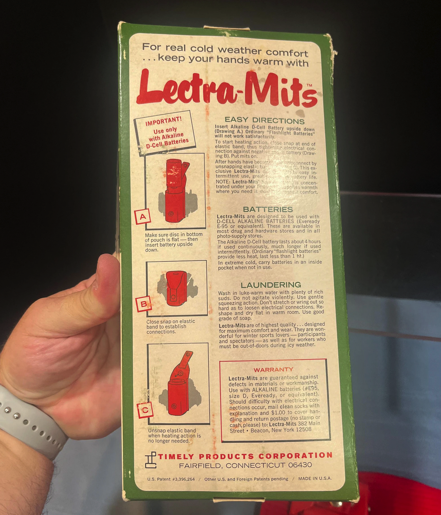 The text on the back of the box. For real cold weather comfort ... keep your hands warm with Lectra-Mits IMPORTANTβ’ Use only with Alkaline s D-Cell Batteries EASY DIRECTIONS Insert Alkaline D-Cell Battery upside down (Drawing A.) Ordinary "Flashlight Batteries" will not work satisfactorily. To start heating action close snap at end of elastic band BATTERIES Lectra-Mits are designed to be used with D-CELL ALKALINE BATTERIES (Eveready E-95 or equivalent). These are available in most drug and hardware stores and in all photo-supply stores. The Alkaline D-Cell battery lasts about 4 hours if used continuously, much longer if used intermittently. (Ordinary"flashlight batteries" provide less heat, last less than 1 hr.) In extreme cold, carry batteries in an inside pocket when not in use. LAUNDERING Wash in luke-warm water with plenty of rich suds. Do not agitate violently. Use gentle squeezing action. Don't stretch or wring out so hard as to loosen electrical connections. Re-shape and dry flat in warm room. Use good grade of soap. Unsnap elastic band when heating action is no longer needed. WARRANTY Lectra-Mits are guaranteed against defects in materials or workmanship. to: Lectra-Mits 382 Main Street Beacon, New York, 12508 TIMELY PRODUCTS CORPORATION FAIRFIELD, CONNECTICUT 06430 U.S. Patent 3396264 / Other U.S. and Foreign Patents pending / MADE IN U.S.A.