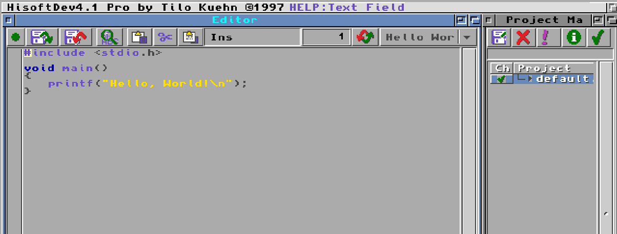The screenshot show the Hisoft C IDE on Amiga (emulated under Amiberry).