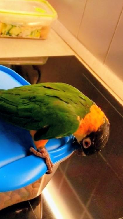 the parrot Nemo stands on a box of treats trying to beak the lid off