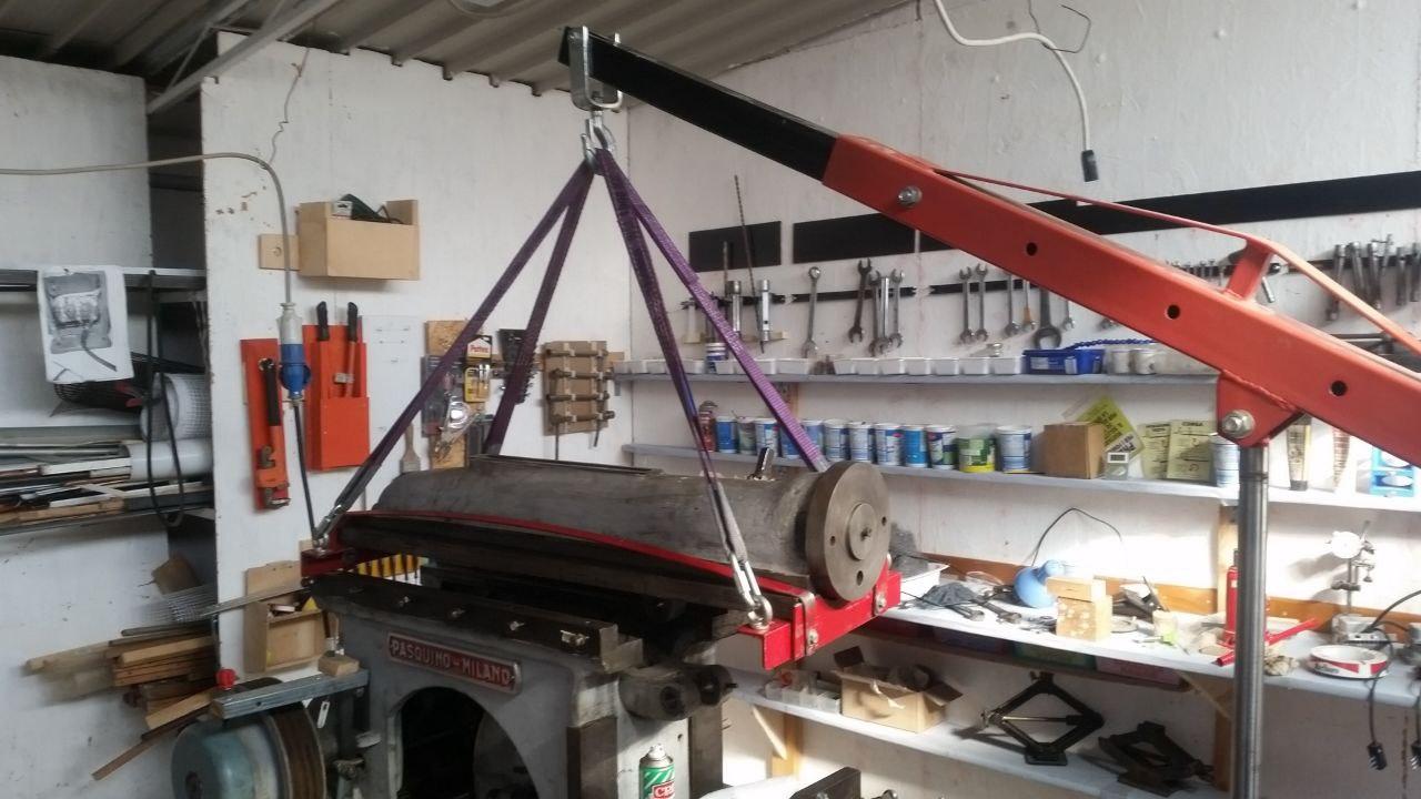 Testa della limatrice appesa alla capra con cinghie viola. La capra ha il braccio troppo corto per arrivare al punto giusto: devo allungarlo.