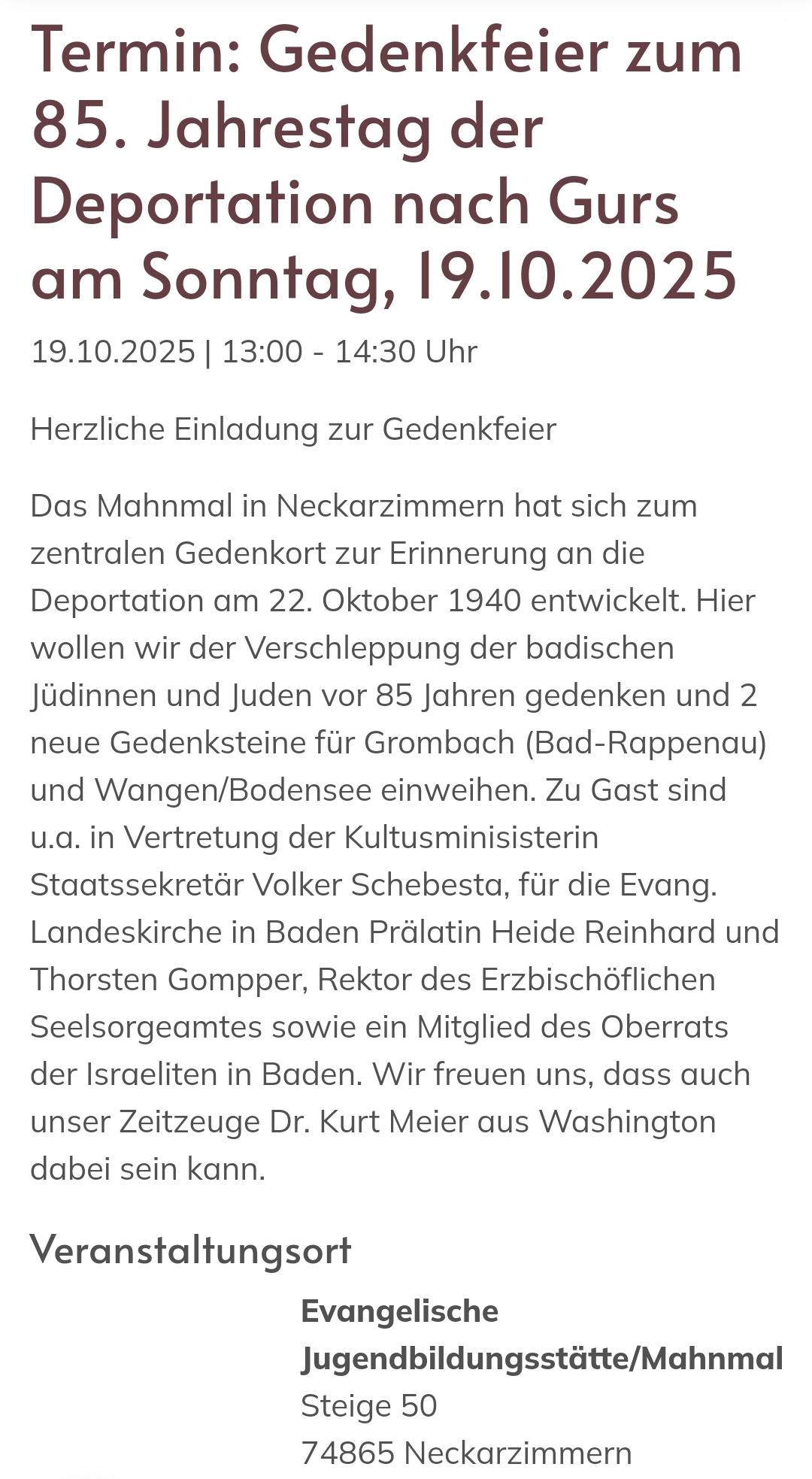Screenshot des Termins am 19.10.25 von der Homepage www.mahnmal-neckarzimmern.de : Termin: Gedenkfeier zum 85. Jahrestag der Deportation nach Gurs am Sonntag, 19.10.2025 19.10.2025| 13:00 - 14:30 Uhr Herzliche Einladung zur Gedenkfeier Das Mahnmal in Neckarzimmern hat sich zum zentralen Gedenkort zur Erinnerung an die Deportation am 22. Oktober 1940 entwickelt. Hier wollen wir der Verschleppung der badischen Jüdinnen und Juden vor 85 Jahren gedenken und 2 neue Gedenksteine für Grombach (Bad-Rappenau) und Wangen/Bodensee einweihen. Zu Gast sind u.a. in Vertretung der Kultusminisisterin Staatssekretär Volker Schebesta, für die Evang. Landeskirche in Baden Prälatin Heide Reinhard und Thorsten Gompper, Rektor des Erzbischöflichen Seelsorgeamtes sowie ein Mitglied des Oberrats der Israeliten in Baden. Wir freuen uns, dass auch unser Zeitzeuge Dr. Kurt Meier aus Washington dabei sein kann Veranstaltungsort Evangelische Jugendbildungsstätte/Mahnmal Steige 50 74865 Neckarzimmern
