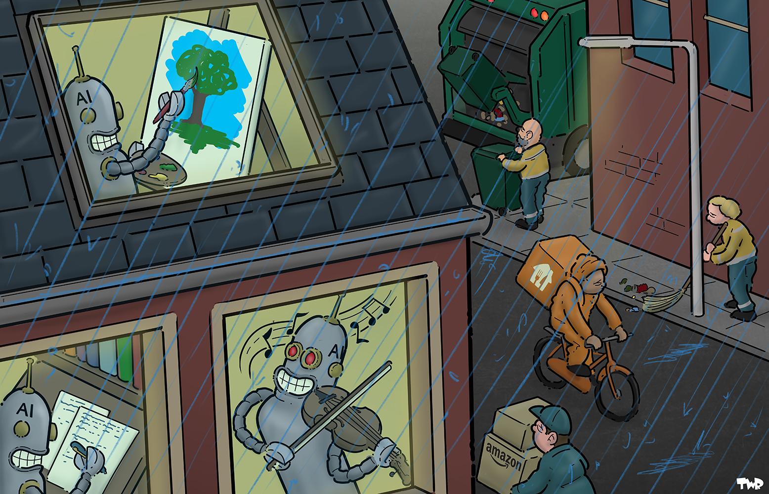 Cartoon showing a street in the rain. A man on a bike is delivering food, while another courier is delivering packages from Amazon. Two other workers are collecting garbage. Inside one of the houses on the street, we see robots labeled 'AI' sitting dry and warm, engaged in making a paining, playing the violin and writing.