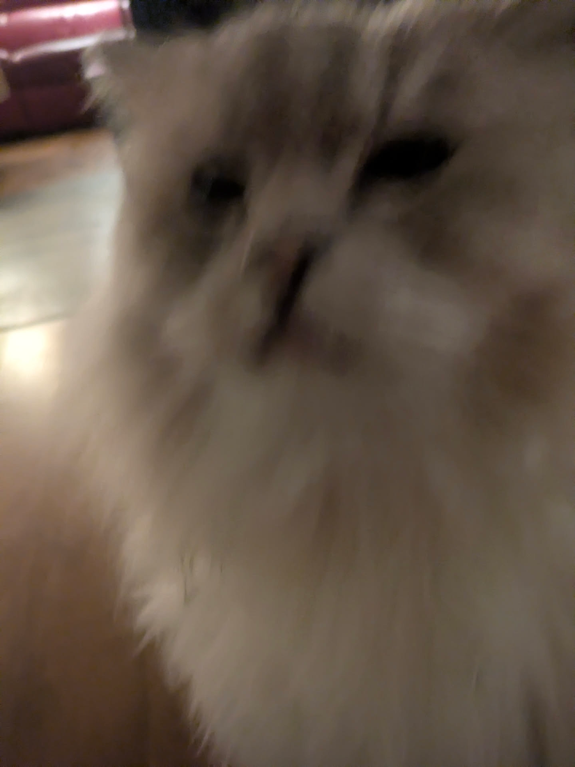 close-up cat photo, very blurred and moved, cat has dramatic face expression