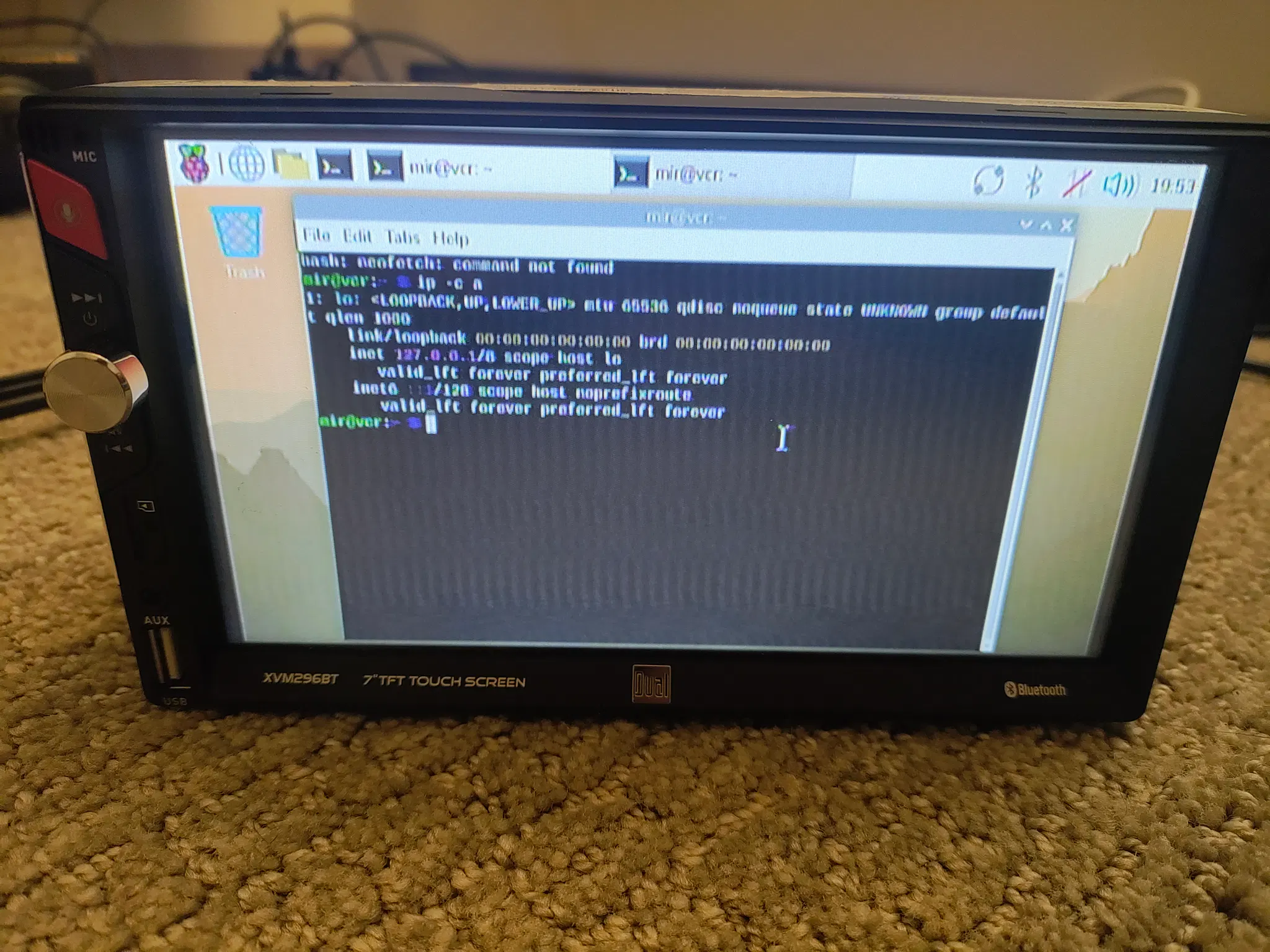 touch screen car stereo sitting on a carpet floor with an indistinct mess of wires in the background. it's a Dual-brand XVM296BT advertising a 7in touchscreen and Bluetooth. on the left bezel edge there are forward-backward buttons, a red mic button, a silver dial, and microsd, aux, and USB inputs. the screen itself is showing raspberry pi os with a terminal open. the user is mir and the hostname is vcr. the terminal shows a failed attempt to run neofetch, and the results of ip -c a (no network besides loopback, despite this being a pi zero W)