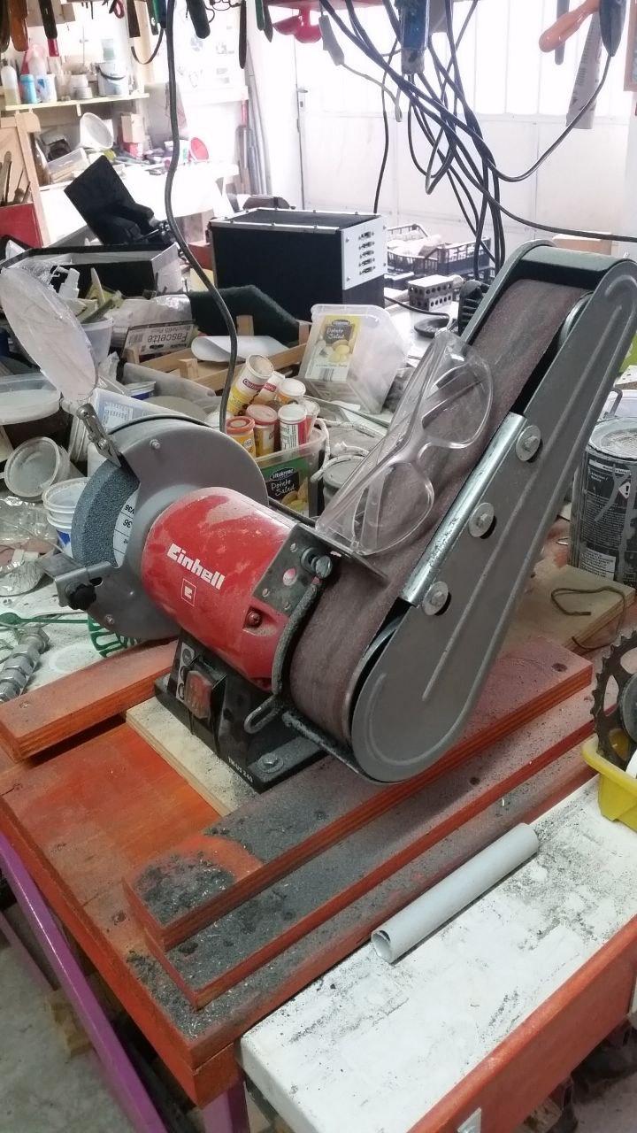 Levigatrice a nastro con occhiali di protezione appoggiati sul nastro.