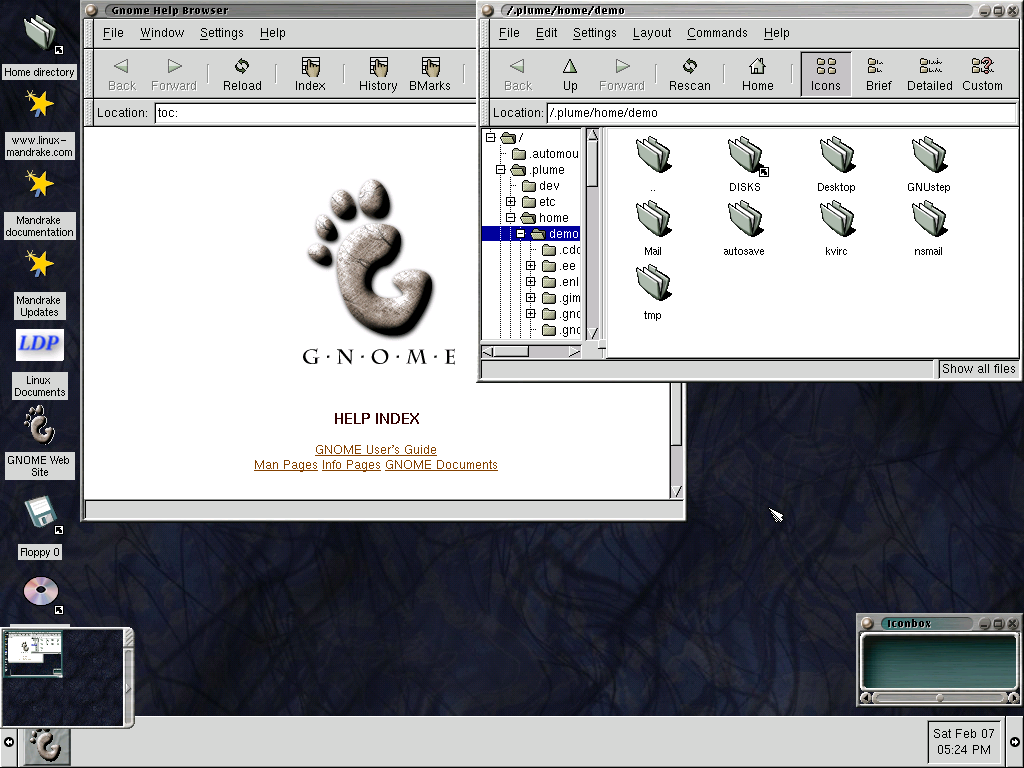 Screenshot of Gnome 1 desktop on Mandrake 6 DemoLinux, showing default desktop: a help browser, a file browser, a handful of icons on the desktop