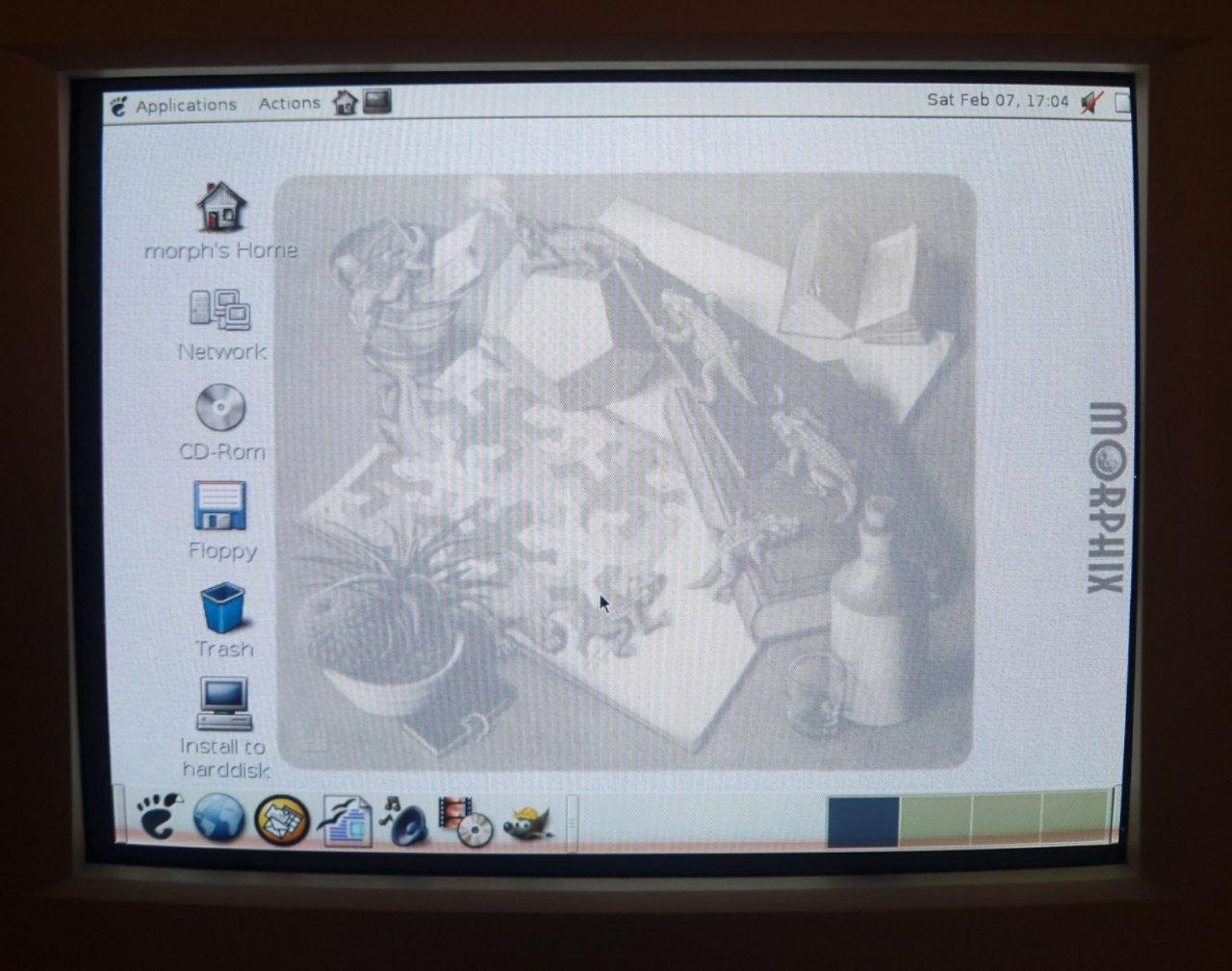 A photograph of a CRT that shows Morphix OS with Gnome 2.4. There are panels at the top and at the bottom of the screen, showing many icons - including GIMP, Open Office, Firefox...