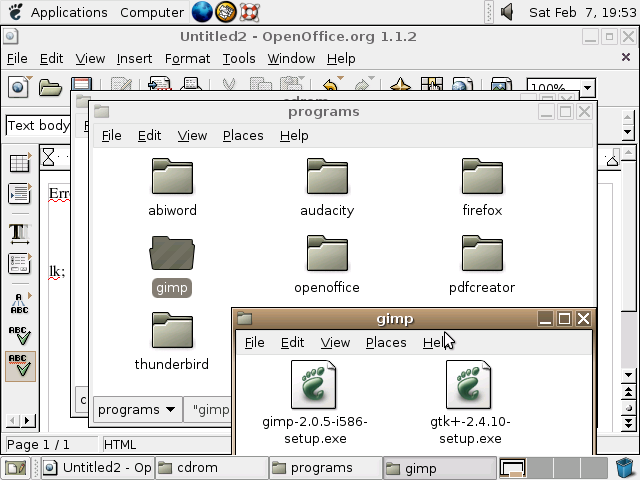 A screenshot of Ubuntu 4.10 running Gnome 2.8. There's Open Office in the background, and a file manager showing the contents of the CD in the foreground. The CD has all sorts of Windows programs