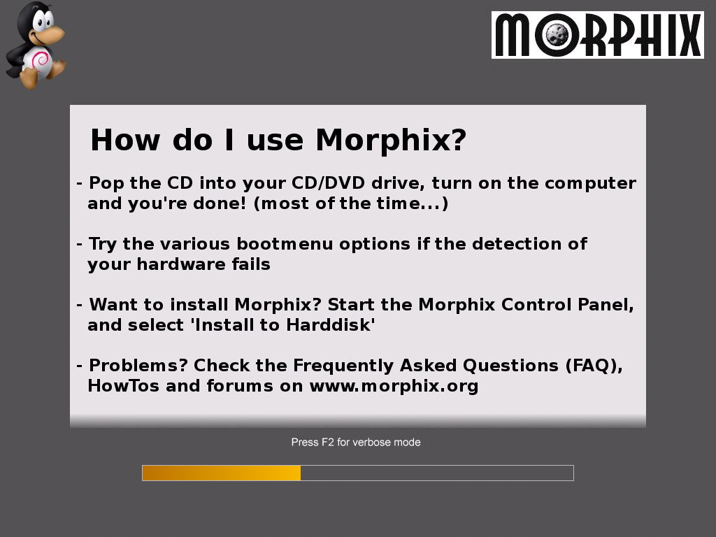 Morphix splash screen - showing a progress bar some tips about the operating system
