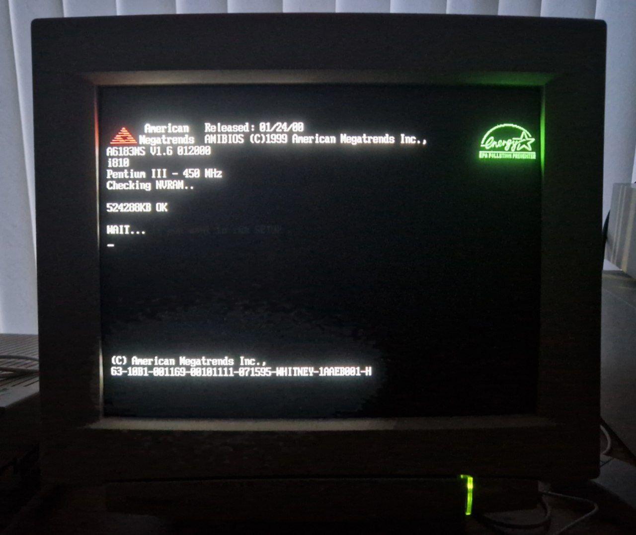 A photo of a CRT showing how a computer boots. It says Pentium III 450 MHz with 512 MB of RAM