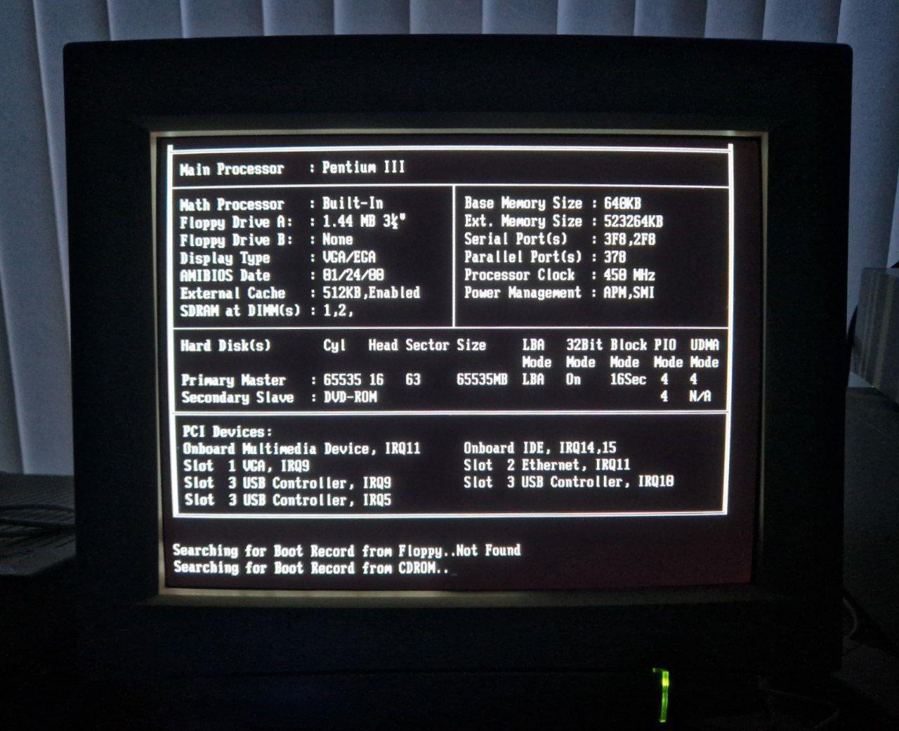 Full table of the computer specs as displayed by the BIOS. Photo of a CRT screen