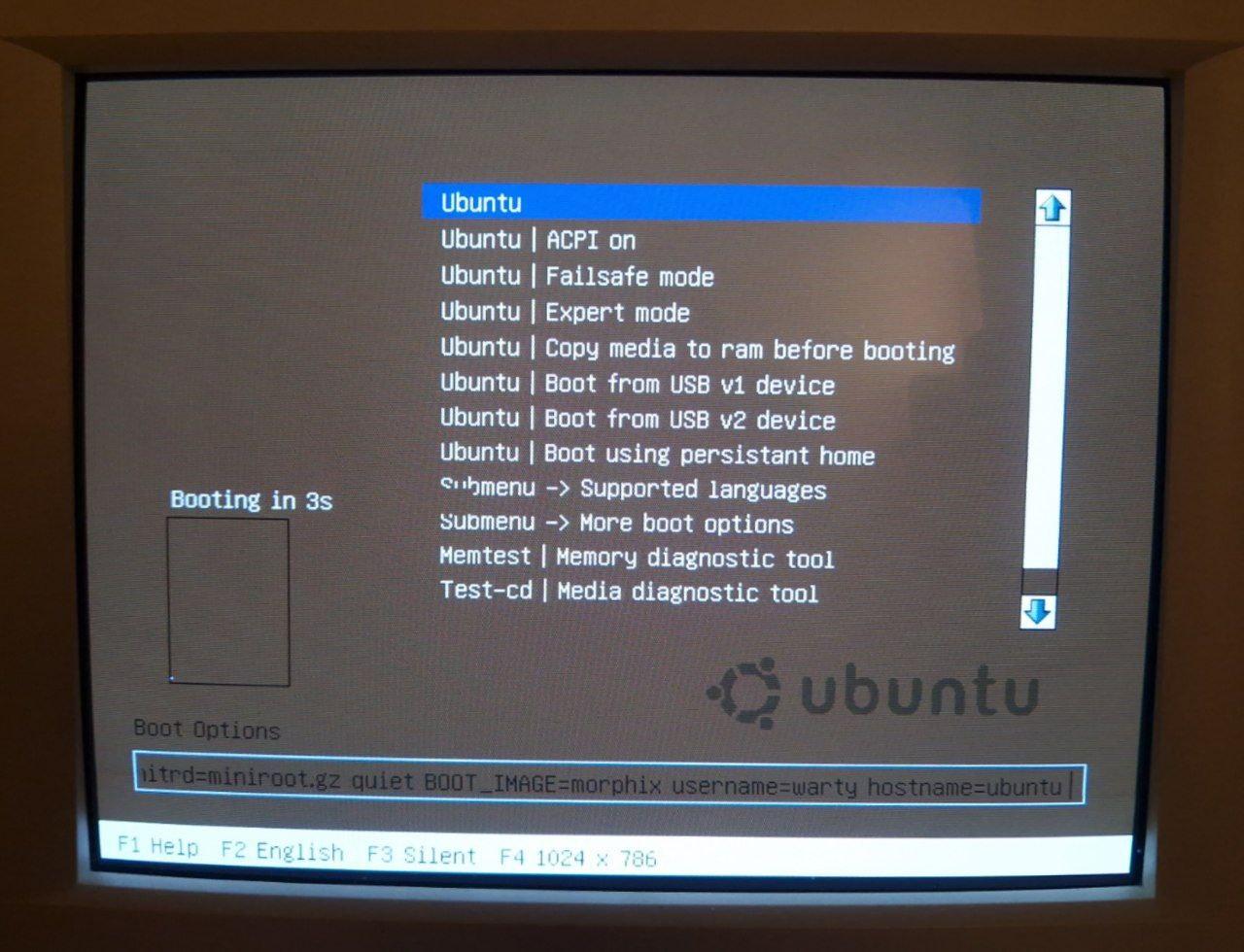 Ubuntu 4.10 Live CD boot screen as seen on the CRT