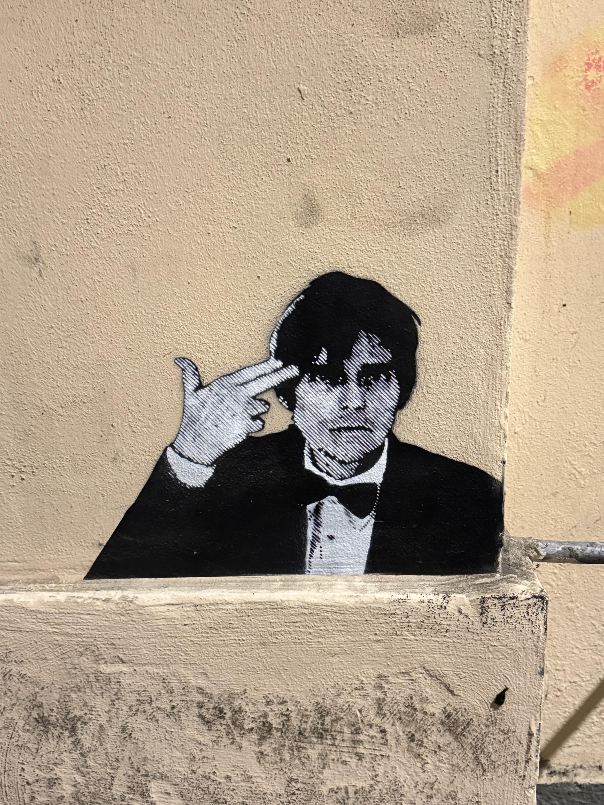 Street art, tipo manifestino di carta sagomato, in bianco e nero, che riproduce una foto di Freak Antoni.