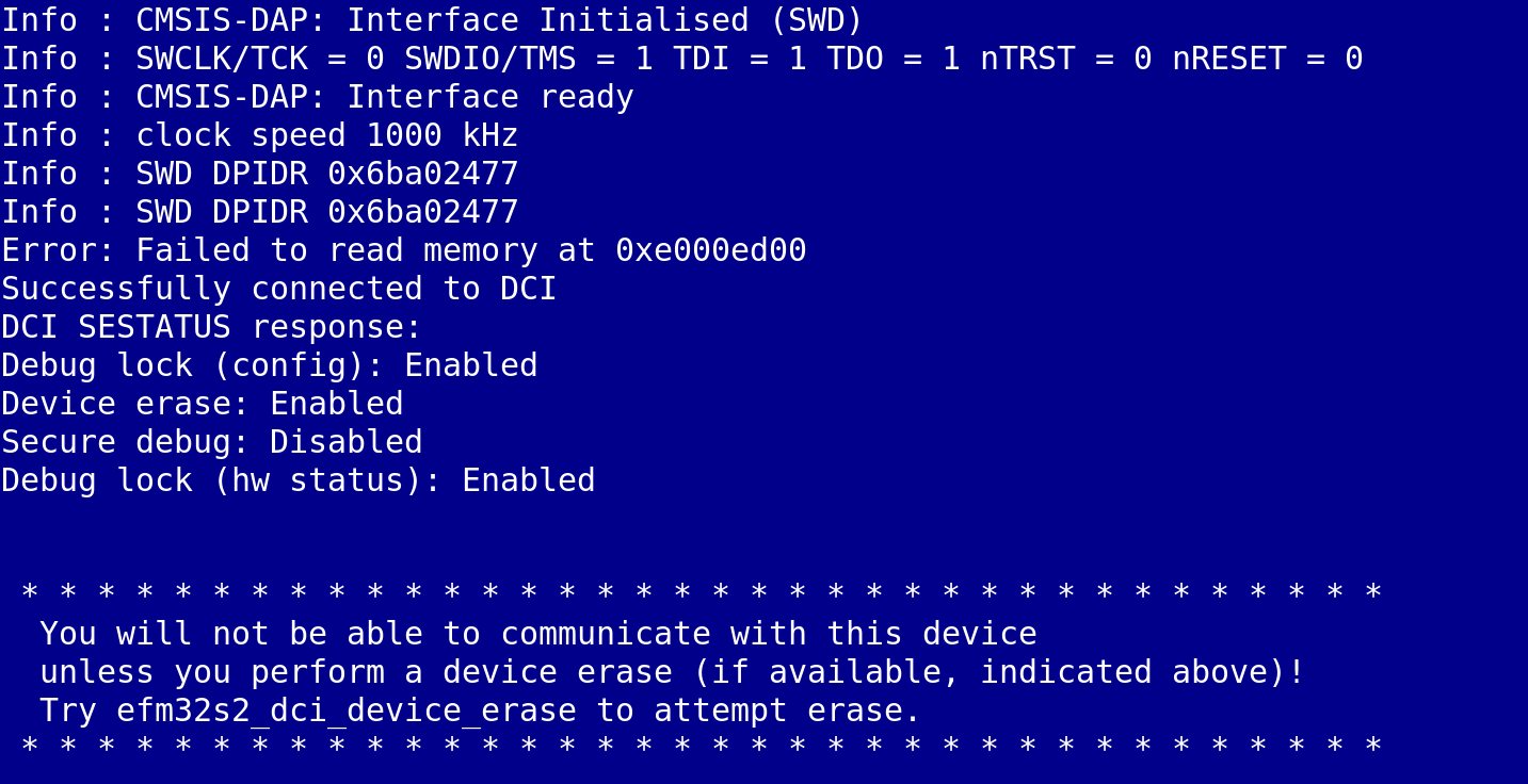 screenshot of openocd saying "debug lock: enabled" along with "you will not bea ble to communicate with this device unless you perform a device erase (if available)"