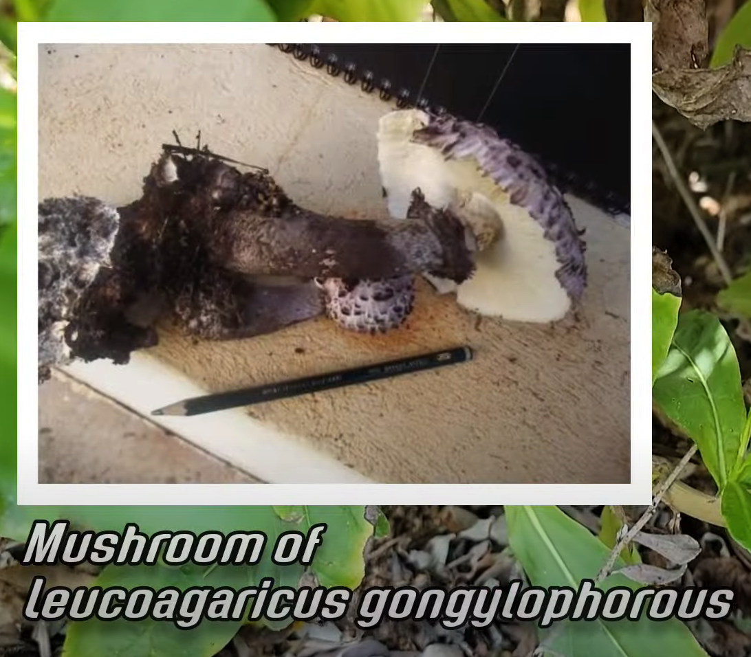 Still from the video showing the mushroom cap of Leucoagaricus gongylophorous the fungus farmed by Atta. It a huge gray mushroom with a flaky textured top, broad stem and white gills.