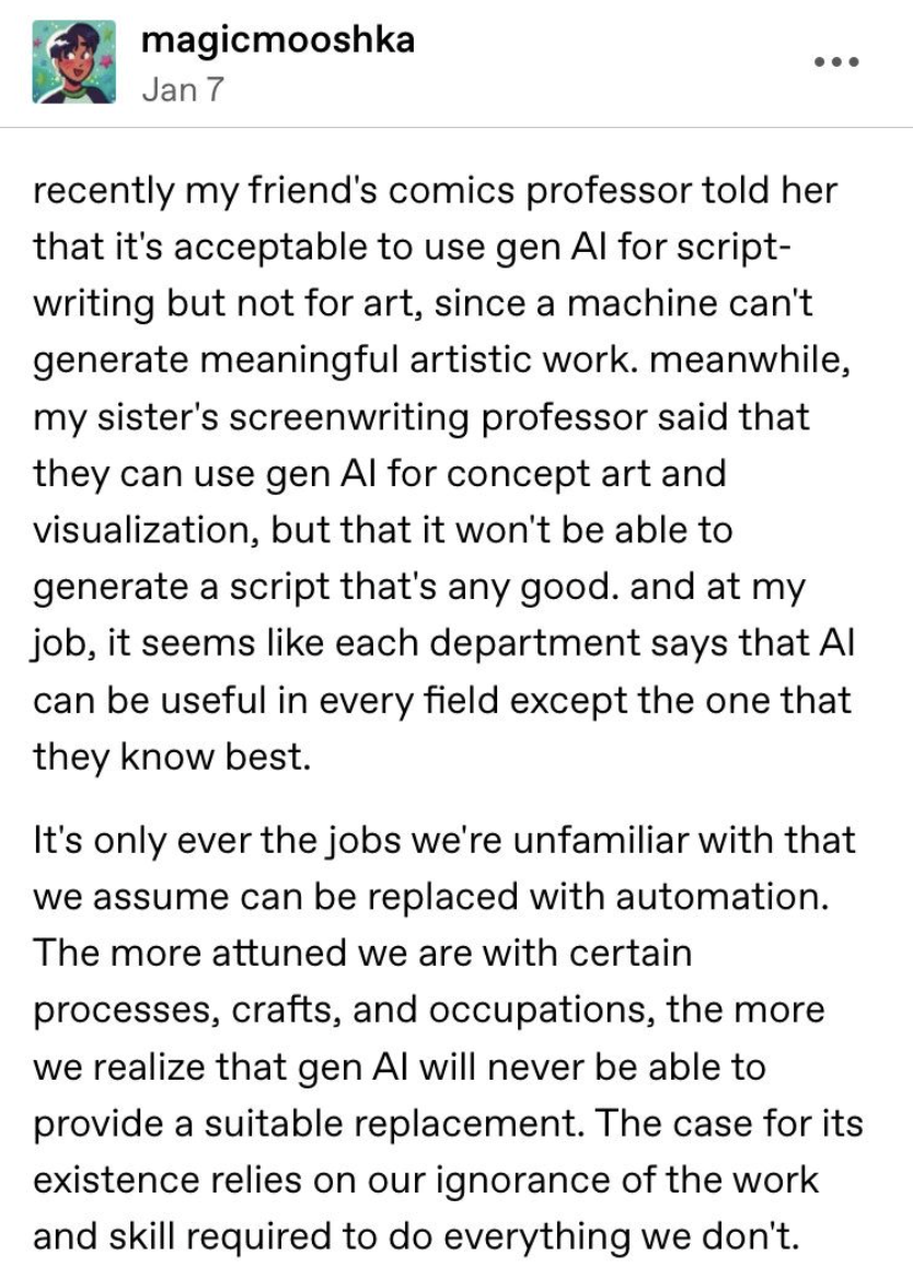 tumblr post from magicmooshka on January 7: recently my friend's comics professor told her that it's acceptable to use gen Al for scriptwriting but not for art, since a machine can't generate meaningful artistic work. meanwhile, my sister's screenwriting professor said that they can use gen Al for concept art and visualization, but that it won't be able to generate a script that's any good. and at my job, it seems like each department says that Al can be useful in every field except the one that they know best. It's only ever the jobs we're unfamiliar with that we assume can be replaced with automation. The more attuned we are with certain processes, crafts, and occupations, the more we realize that gen Al will never be able to provide a suitable replacement. The case for its existence relies on our ignorance of the work and skill required to do everything we don't.