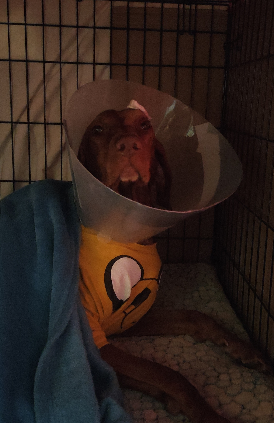 Mia, bracco ungherese di 6 anni e ½, con collare elisabettiano, maglietta gialla di Jake il cane, coperta azzurra, dentro il kennel.