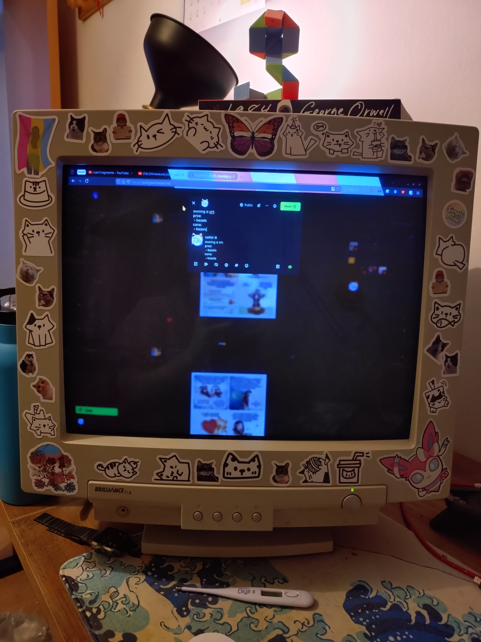 a frontal picture of a crt whose beige bezel is stickerbombed with little cats and a pride sticker on the upper left, lower left and bottom right corners