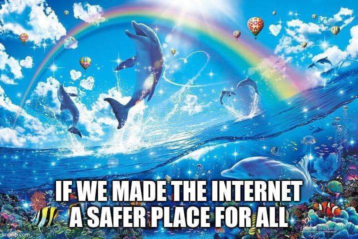 Meme with dolphins swimming in a colourful ocean and with a rainbow in the background, stating: " if we made the internet a safer place for all"