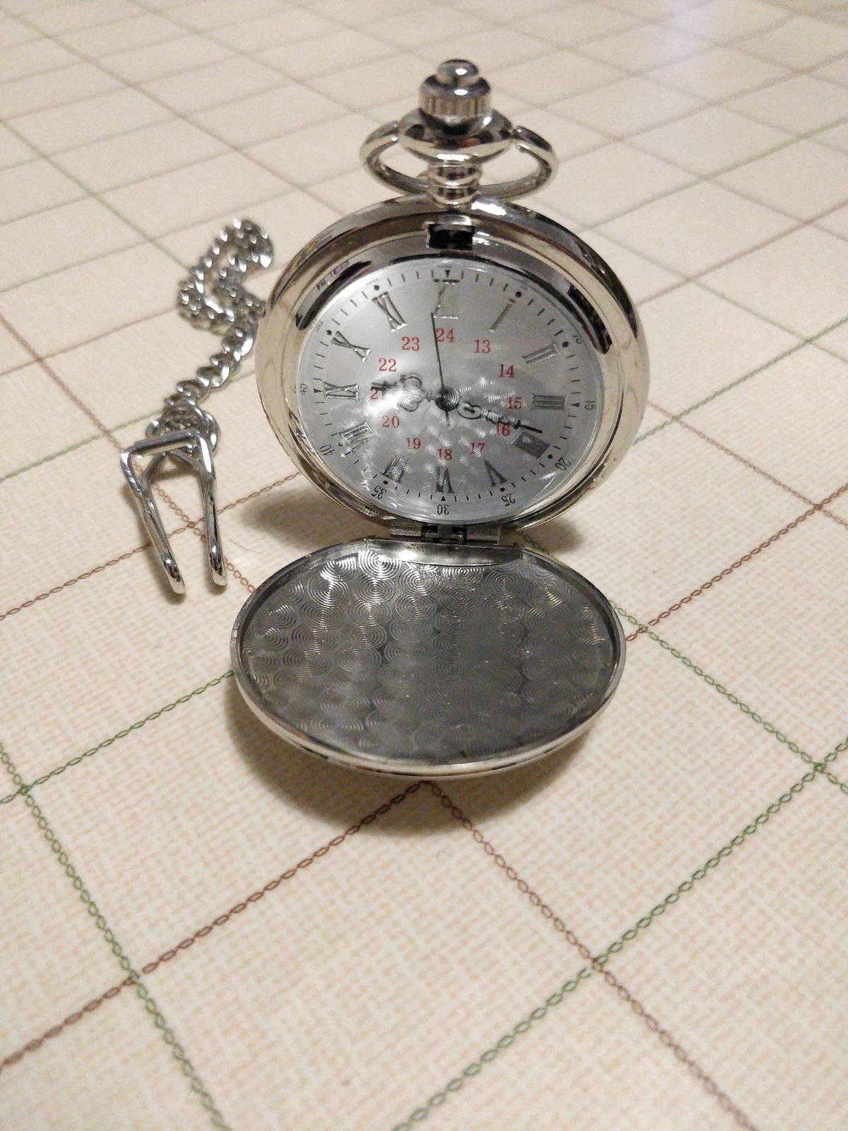 Orologio da taschino argentato, con l'interno bianco, i numeri romani e delle lancette vezzose