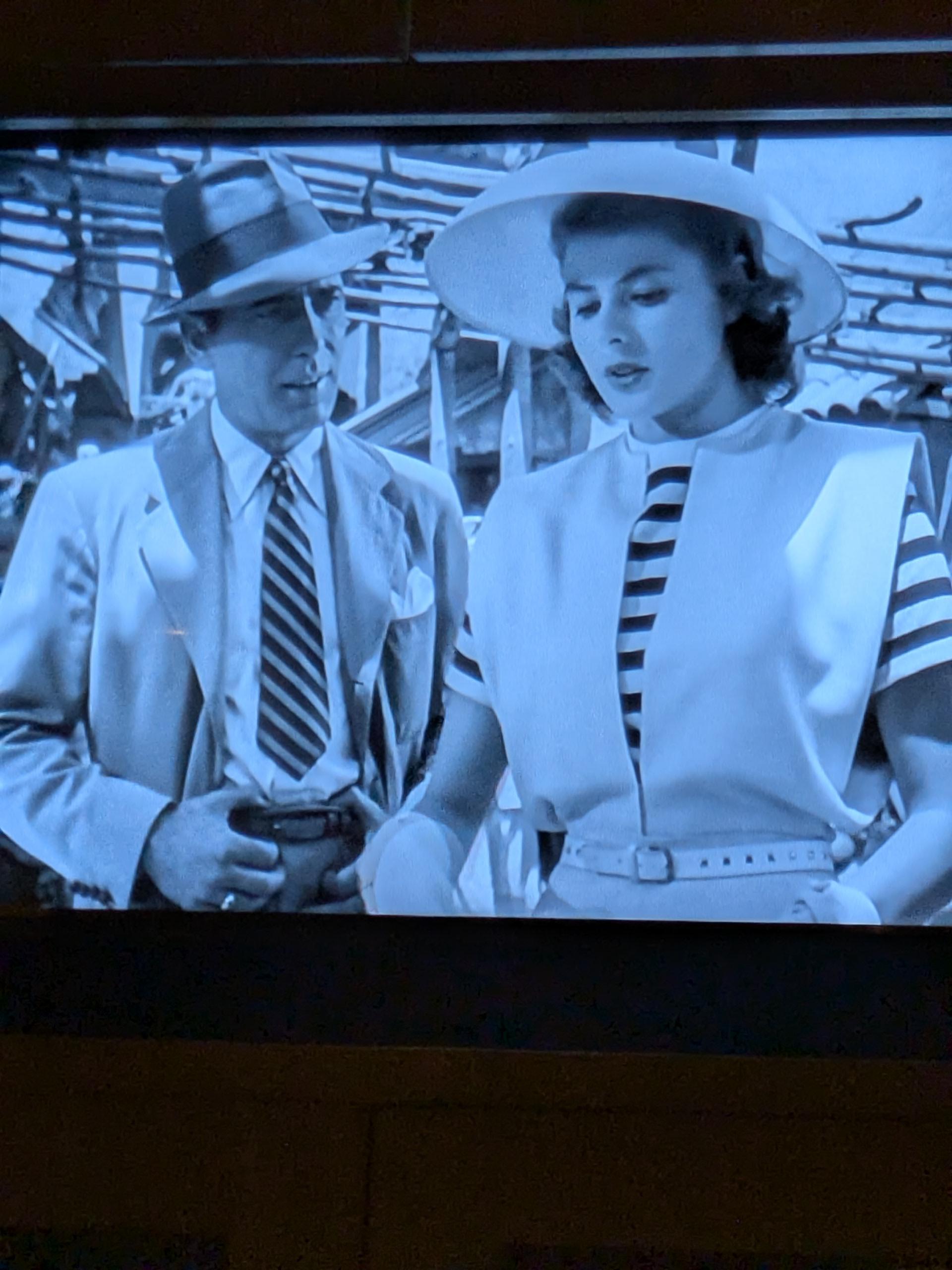 A shot from Casablanca. Rick wearing striped tie and a white jacket, Ilsa wearing a striped top under a white jacket.