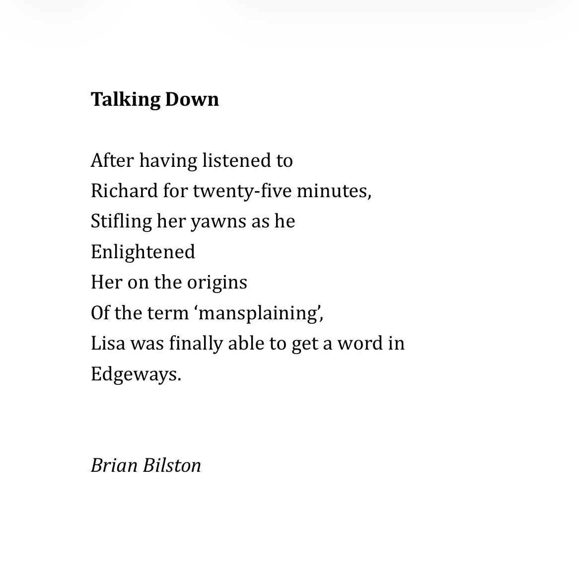 Talking Down Β After having listened to Richard for twenty-five minutes, Stifling her yawns as he Enlightened Her on the origins Of the term βmansplainingβ, Lisa was finally able to get a word in Edgeways. Brian Bilston