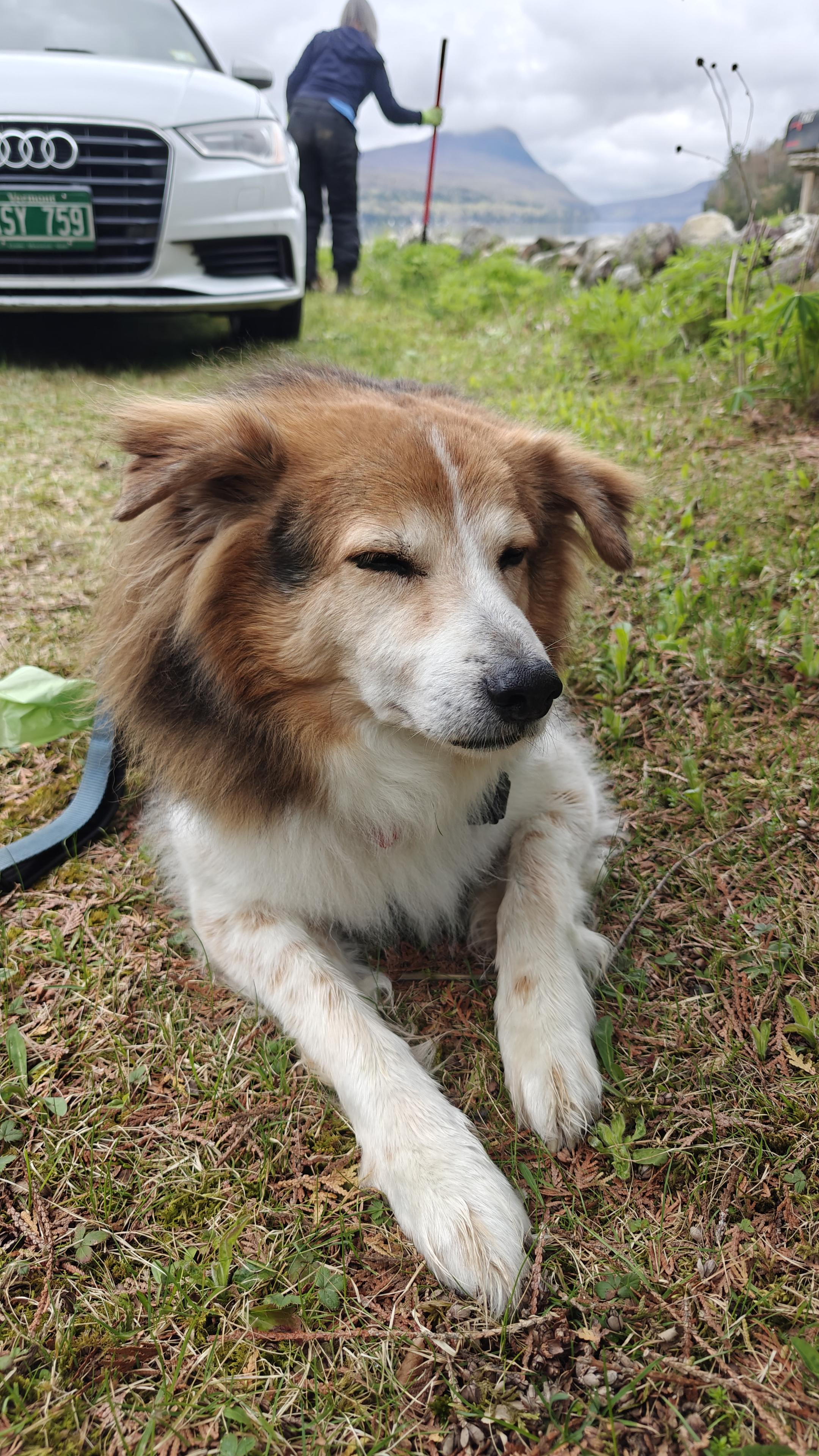 A lovely dog lying on a grass driveway with a car, a woman raking a garden, and a vast lake in background. He is a very good and sweet boy.