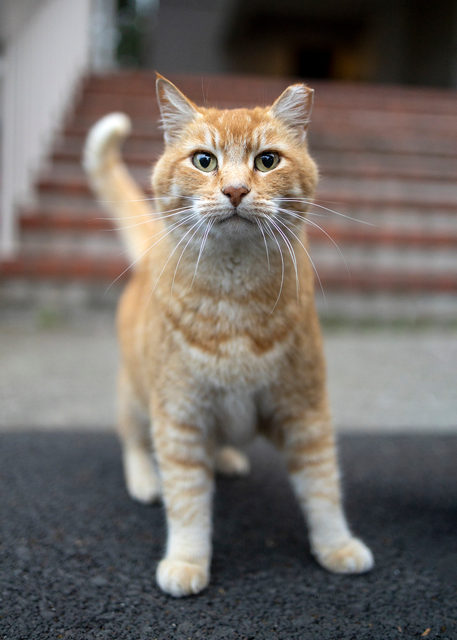 an orange cat with a tipped ear standing at the base of an outdoor staircase