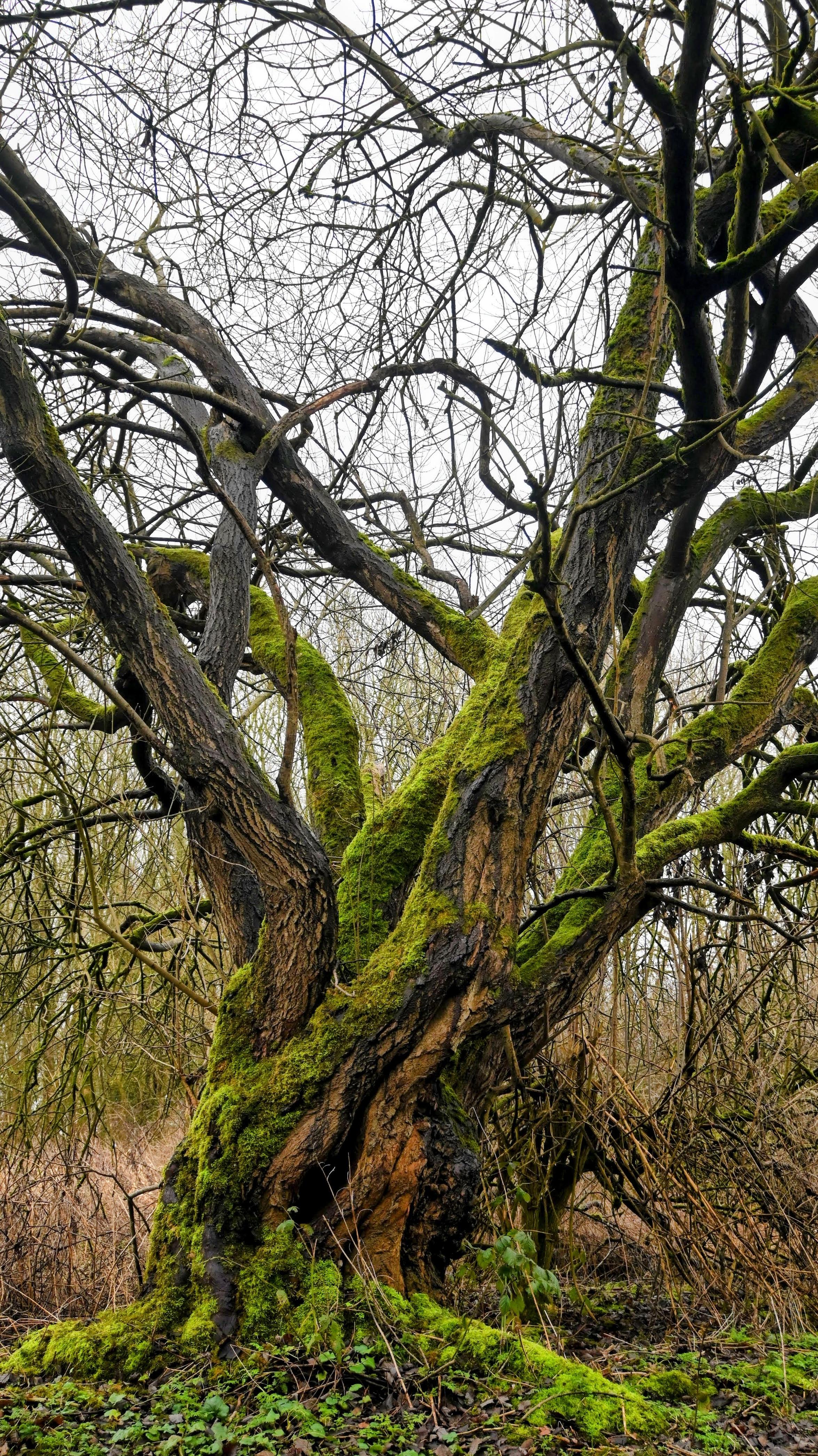 Large tree with no leaves, covered in moss and with a twisted trunk