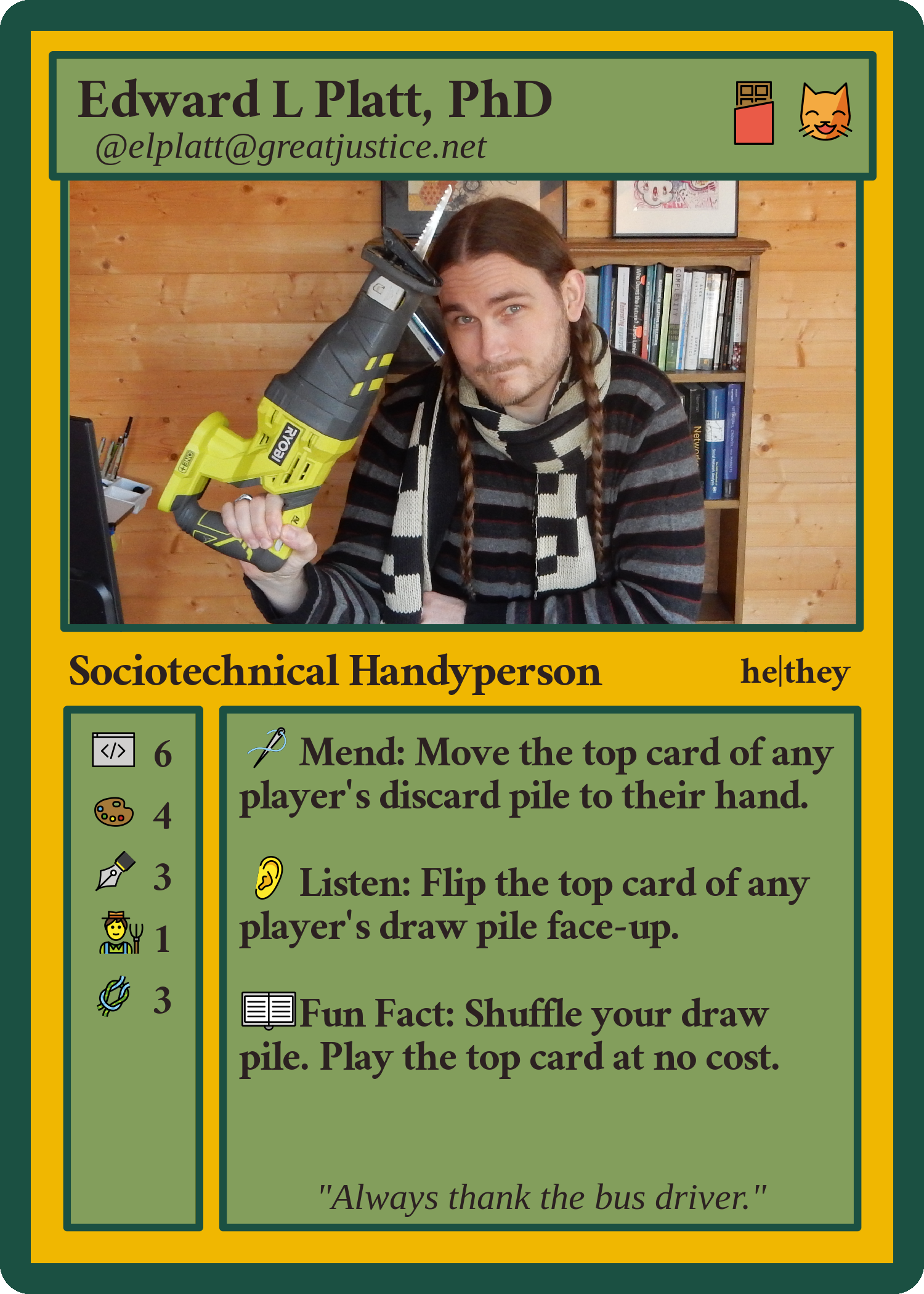 FediCard for Edward L. Platt. Card cost: chocolate and cat. Card image: photo of white man with short facial hair and long braids, wearing a scarf and striped sweater, holding a reciprocating saw, background is wooden wall, bookshelf and art. Card type: sociotechnical handyperson. Pronouns: he|they. Abilities: Mend: move the top card of any player's discard pile to their hand. Listen: Flip the top card of any player's draw pile face-up. Fun Fact: shuffle your draw pile. Play the top card at no cost. Flavor text: "Always thank the bus driver."