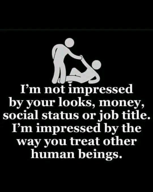 I'm not impressed by your looks, money, social status or job title. Iām impressed by the way you treat other human beings.