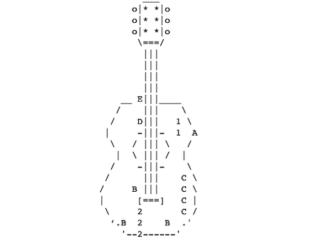A guitar shape is drawn with ascii symbol characters. Numbers and letters indicate the sites where damage is being repaired.
