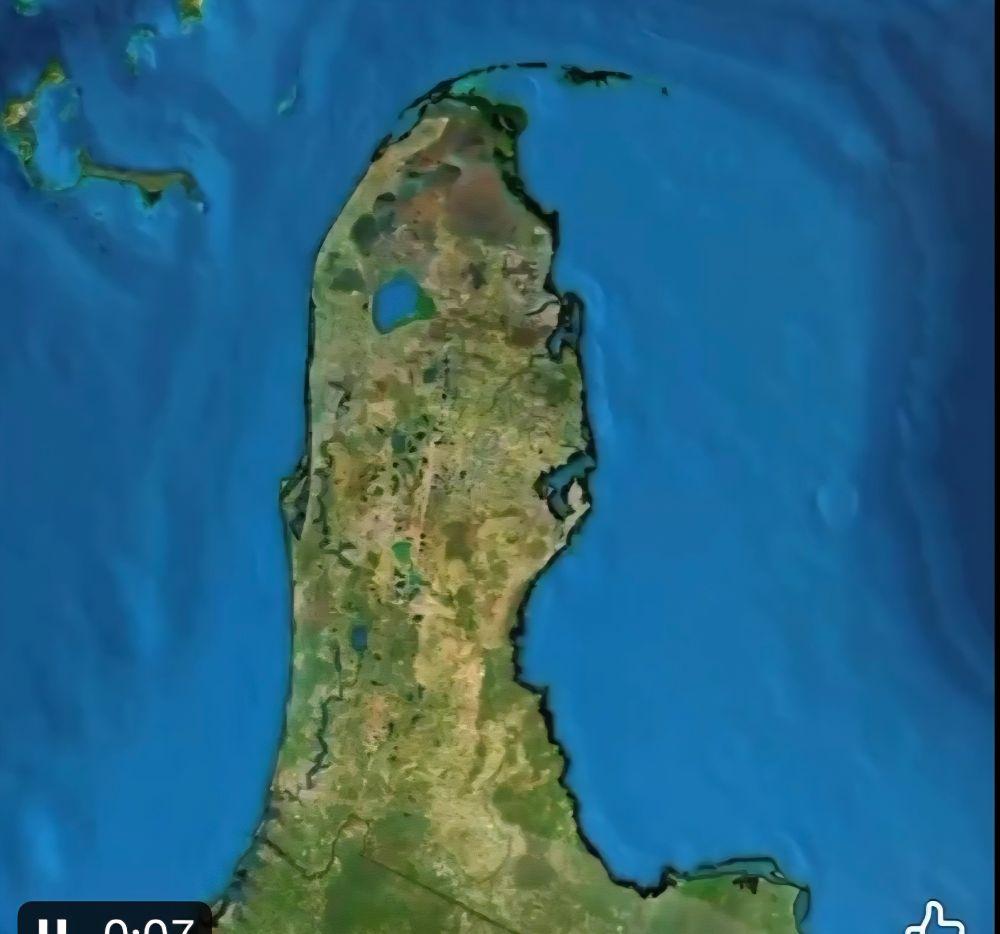 A green florida against a blue sea, tipped upside down and looking like the Grinch's head
