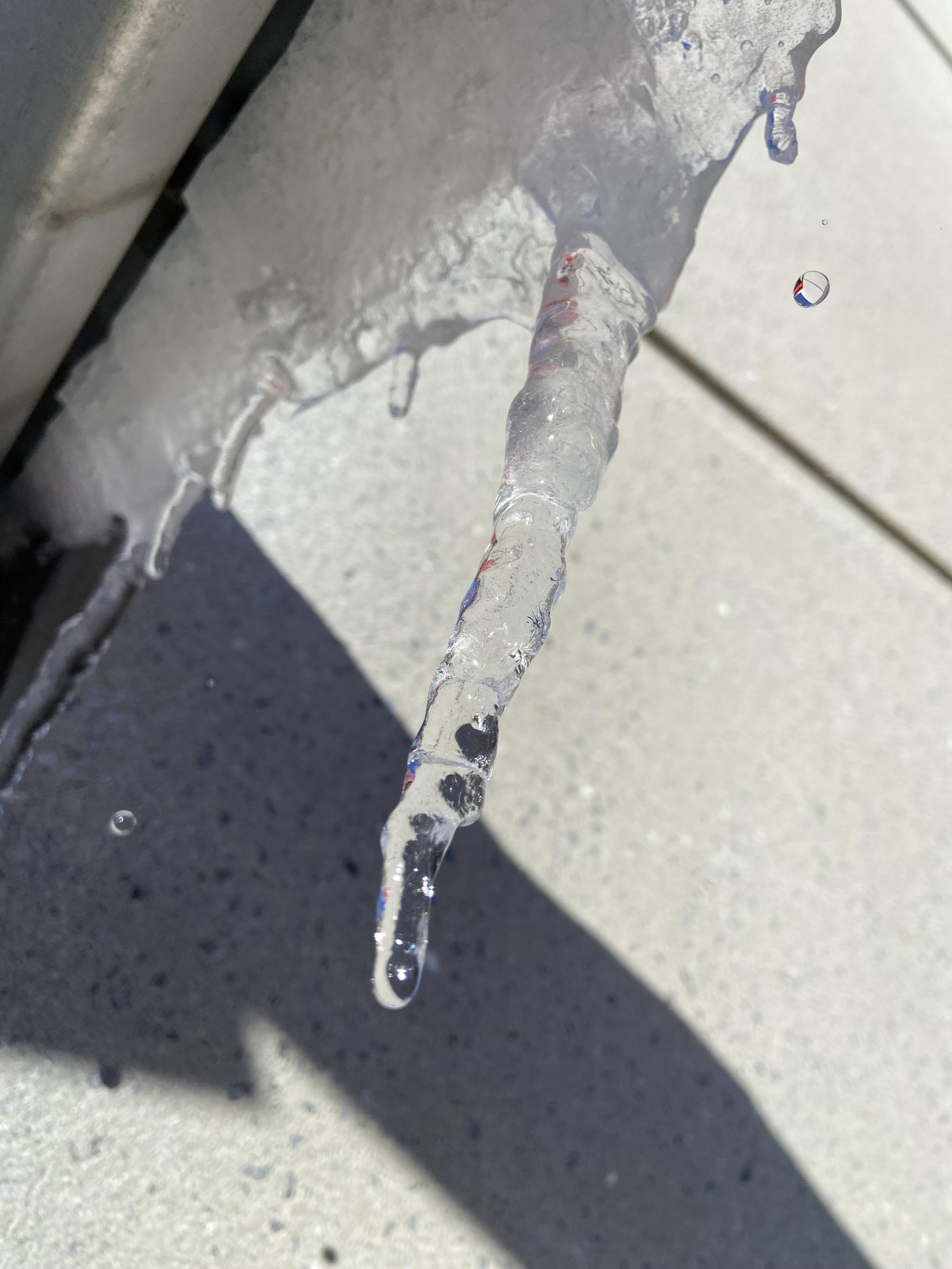 A large icicle hanging from a metal structure, with a concrete wall in the background. A couple of waterdrops are falling midair