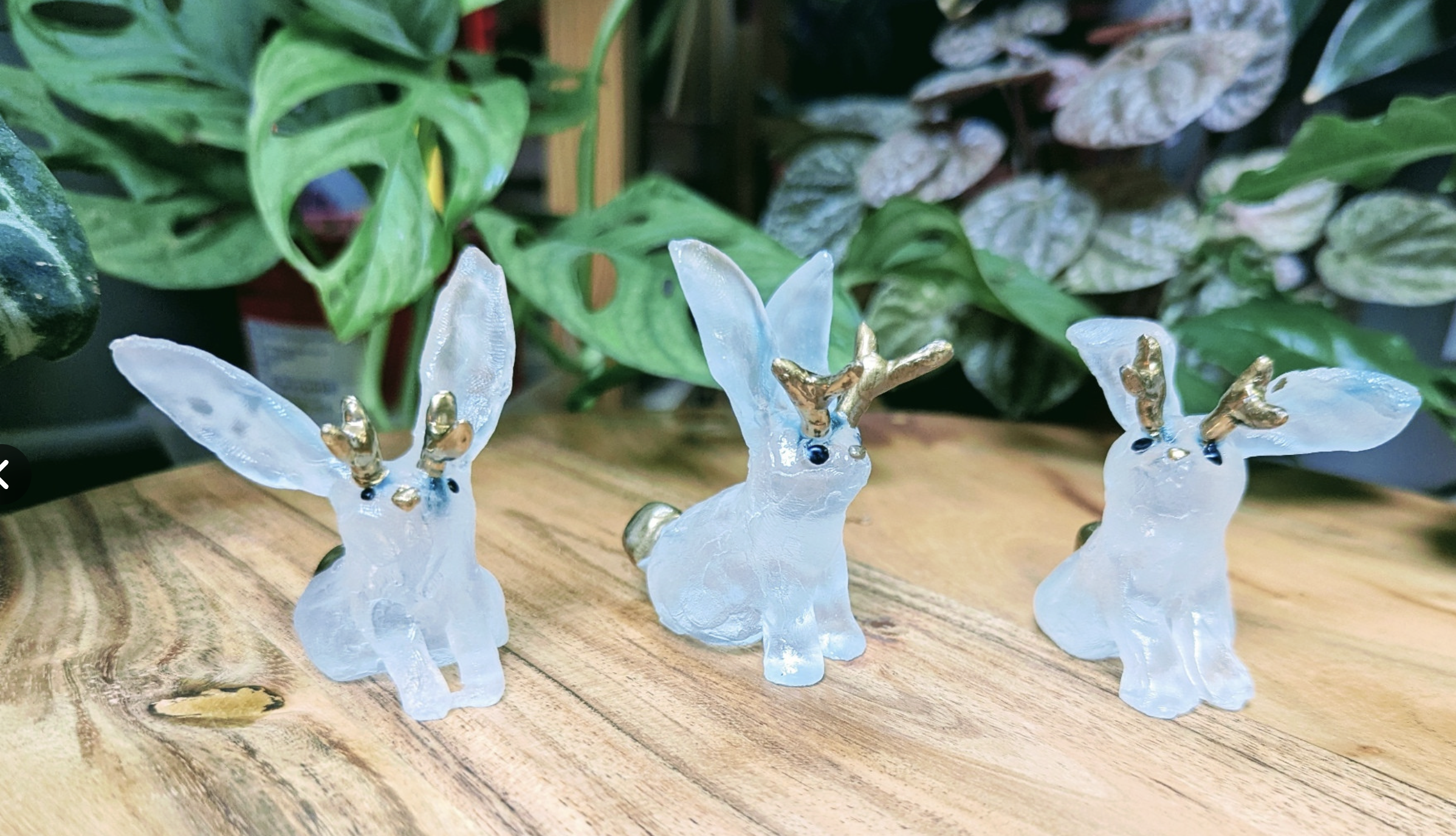 Trois petits lapins en verre. Ils ont des petites cornes dorées en pompon doré ainsi qu'un petit nez doré. Ils sont posés dans un décor avec plein de plantes derrière