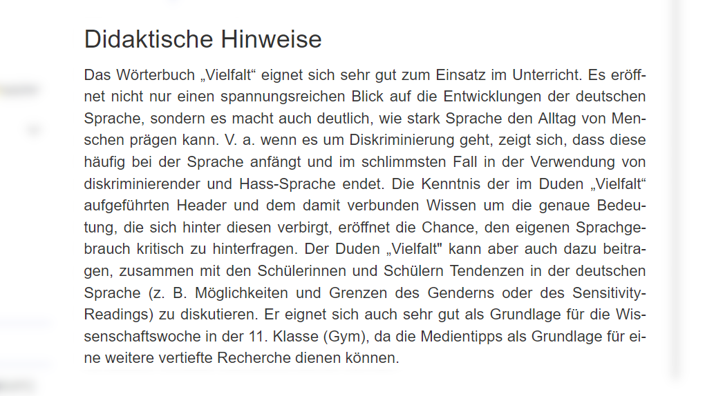 Didaktische Hinweise: Das Wörterbuch „Vielfalt“ eignet sich sehr gut zum Einsatz im Unterricht. Es eröffnet nicht nur einen spannungsreichen Blick auf die Entwicklungen der deutschen Sprache, sondern es macht auch deutlich, wie stark Sprache den Alltag von Menschen prägen kann. V. a. wenn es um Diskriminierung geht, zeigt sich, dass diese häufig bei der Sprache anfängt und im schlimmsten Fall in der Verwendung von diskriminierender und Hass-Sprache endet. Die Kenntnis der im Duden „Vielfalt“ aufgeführten Header und dem damit verbunden Wissen um die genaue Bedeutung, die sich hinter diesen verbirgt, eröffnet die Chance, den eigenen Sprachgebrauch kritisch zu hinterfragen. Der Duden „Vielfalt" kann aber auch dazu beitragen, zusammen mit den Schülerinnen und Schülern Tendenzen in der deutschen Sprache (z. B. Möglichkeiten und Grenzen des Genderns oder des Sensitivity-Readings) zu diskutieren. Er eignet sich auch sehr gut als Grundlage für die Wissenschaftswoche in der 11. Klasse (Gym), da die Medientipps als Grundlage für eine weitere vertiefte Recherche dienen können.