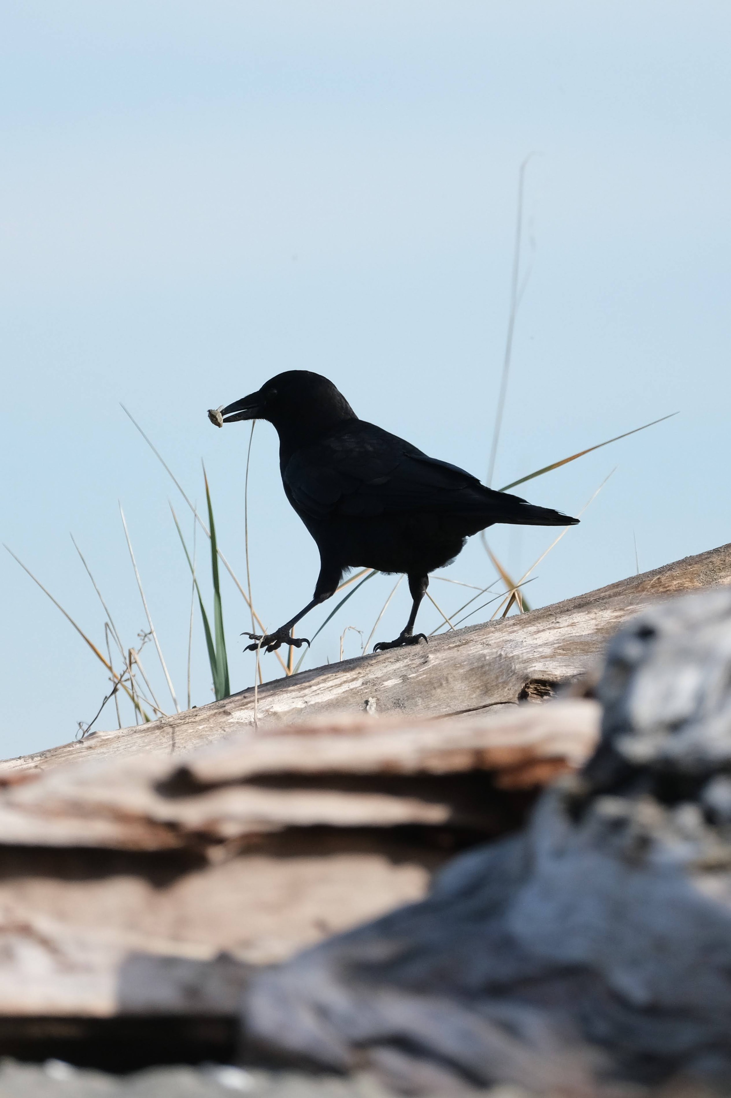 a crow silhouetted against a pale blue sky. he's walking along a piece of driftwood, one foot raised in front of him, and carrying something small in his beak.