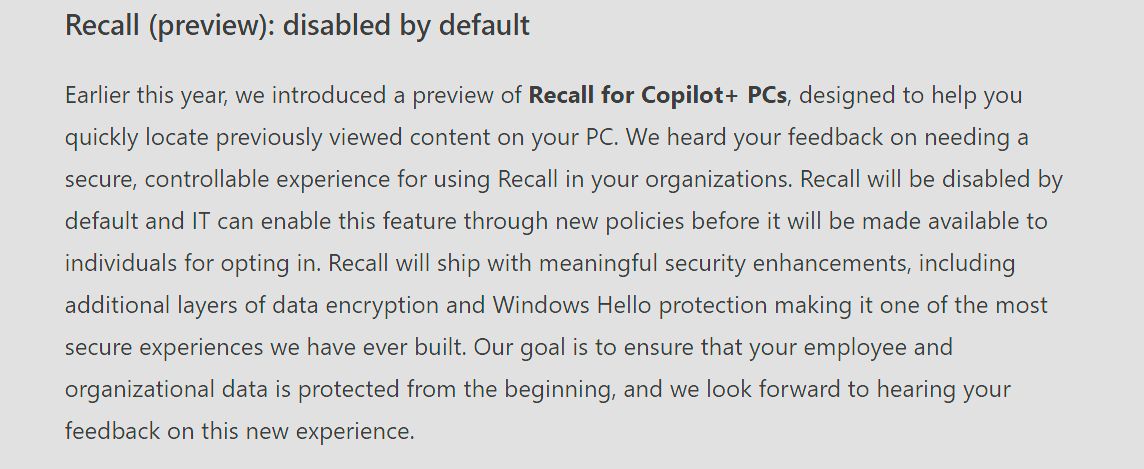 In a newly released blog entitled "Windows: AI-powered, cloud-enabled, and secure", Microsoft say the business versions of Windows will ship with Recall disabled by default - IT departments will have to enable the feature before it is available.
