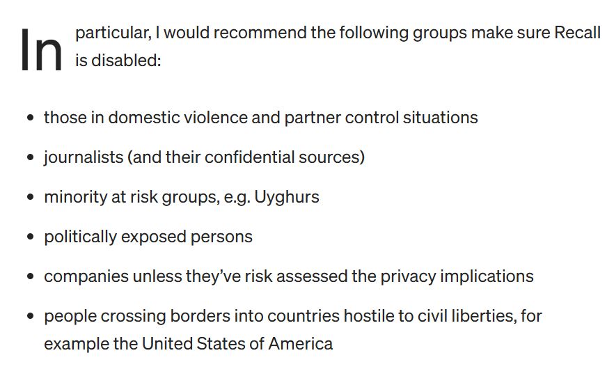 if while using MS recall decides to snap shot the page with identifiable information on it can have SERIOUS Implications for everyone involved.