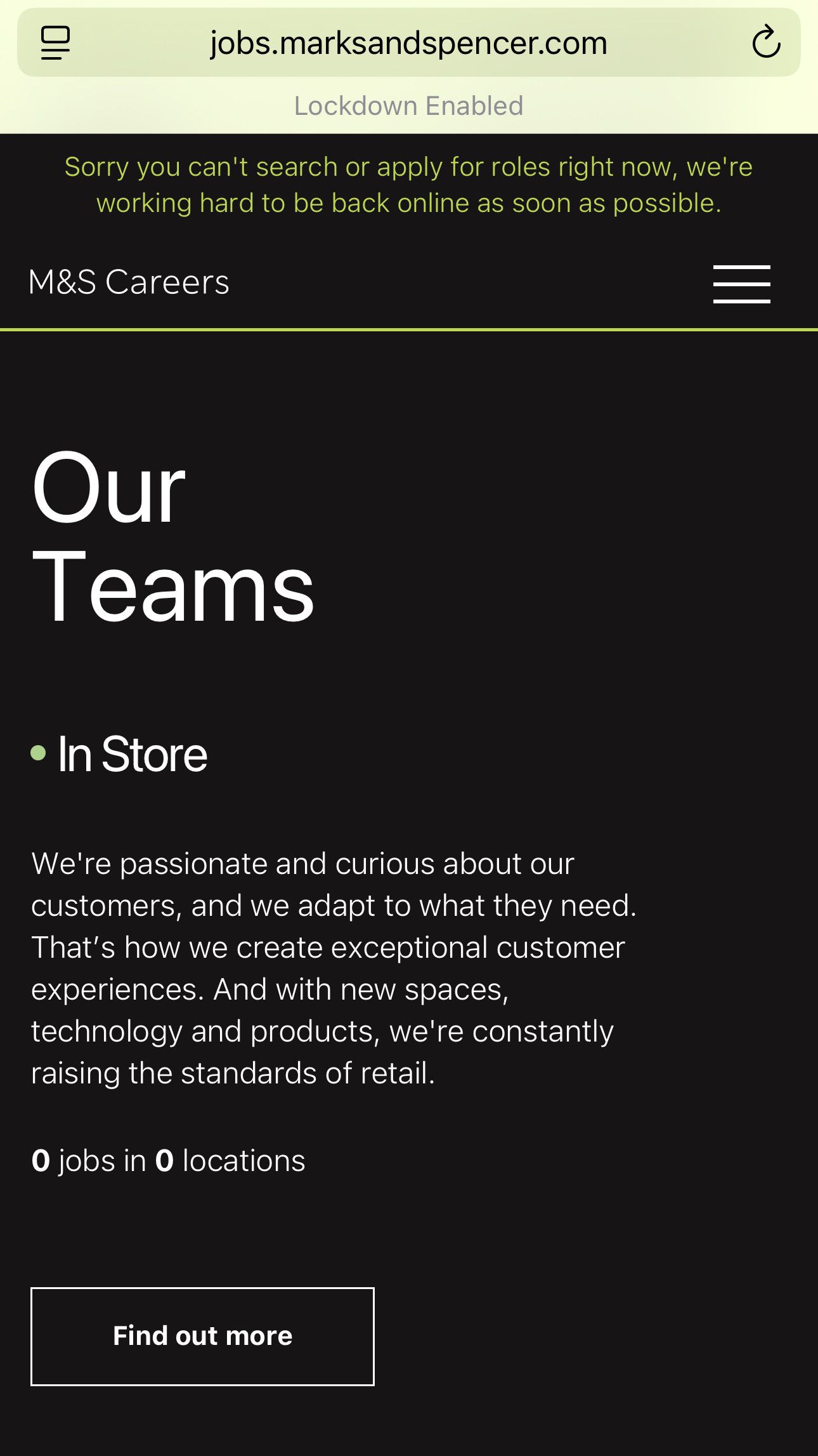All M&S recruitment is still stopped, 19 days in. https://jobs.marksandspencer.com/