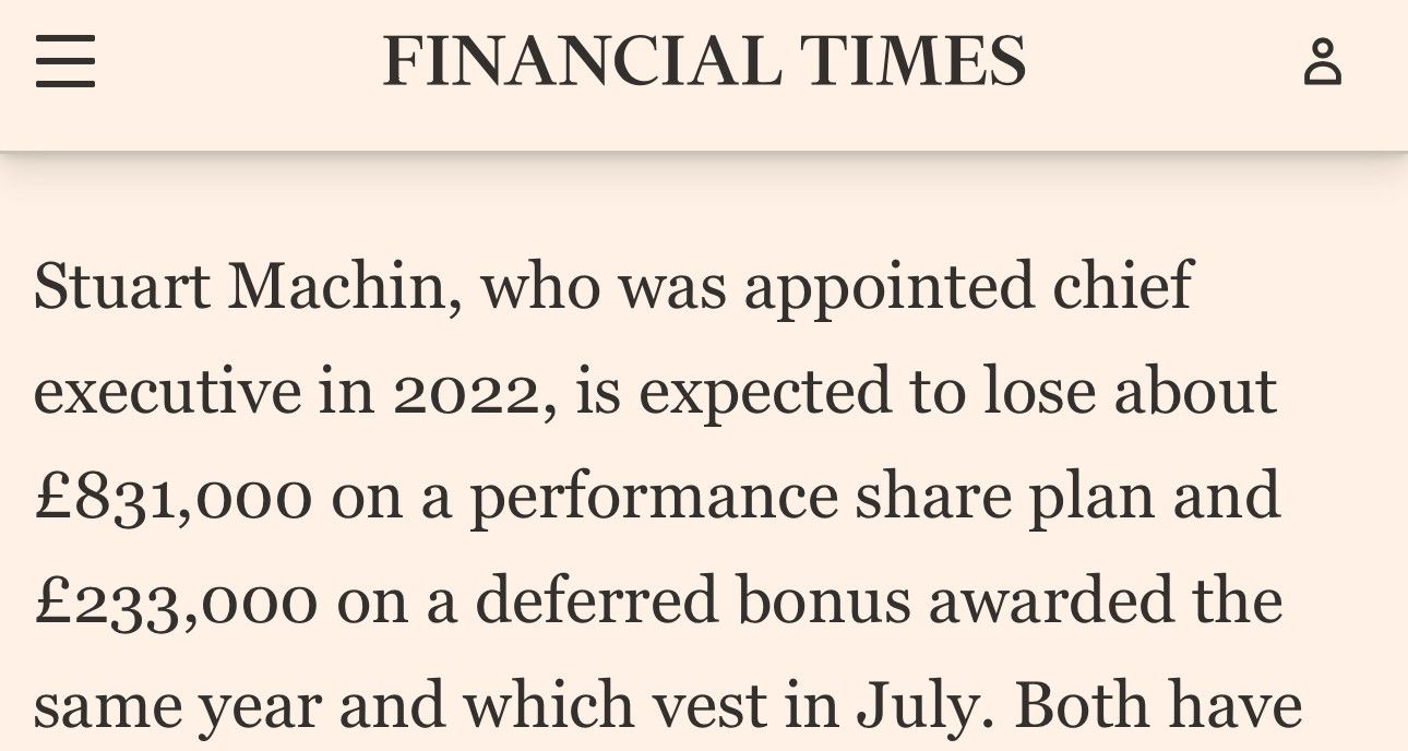Marks and Spencerβs CEO will lose a Β£1.1m share grant as a result of their cyber incident. https://www.ft.com/content/43531d25-4f7a-4d6e-b809-e85bb8f0033e
